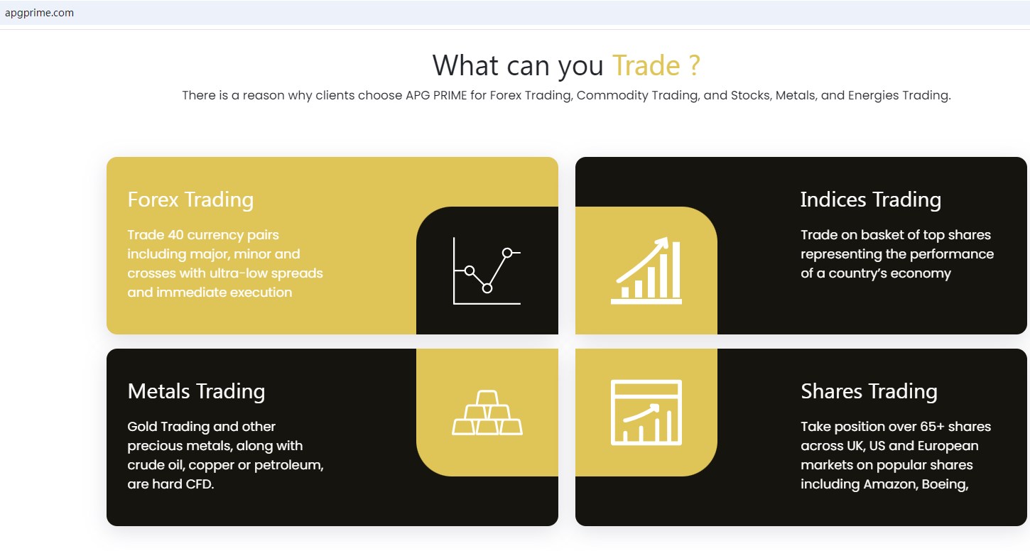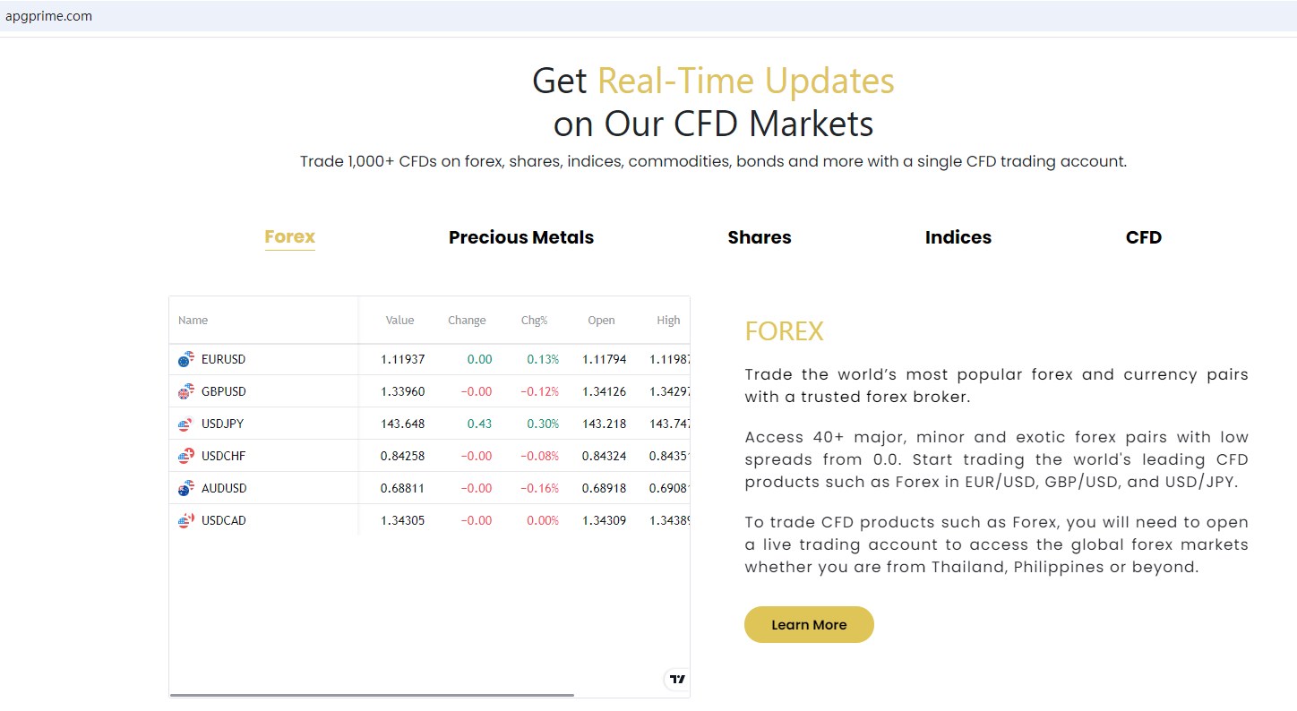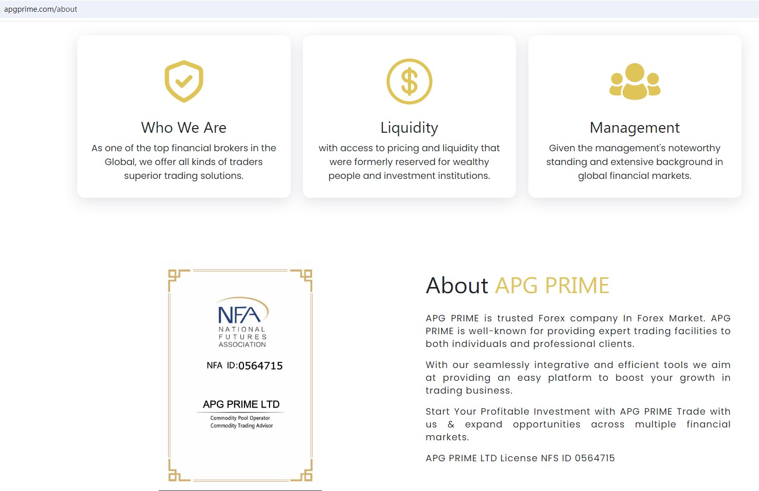 APG PRIME claims to be licensed by the U.S. National Futures Association (NFA) with ID 0564715, is a forex company In Forex Market, which offers a range of investment products to traders, including Forex, Precious Metals, Shares, Indices, CFD and more instruments for trading in global markets.