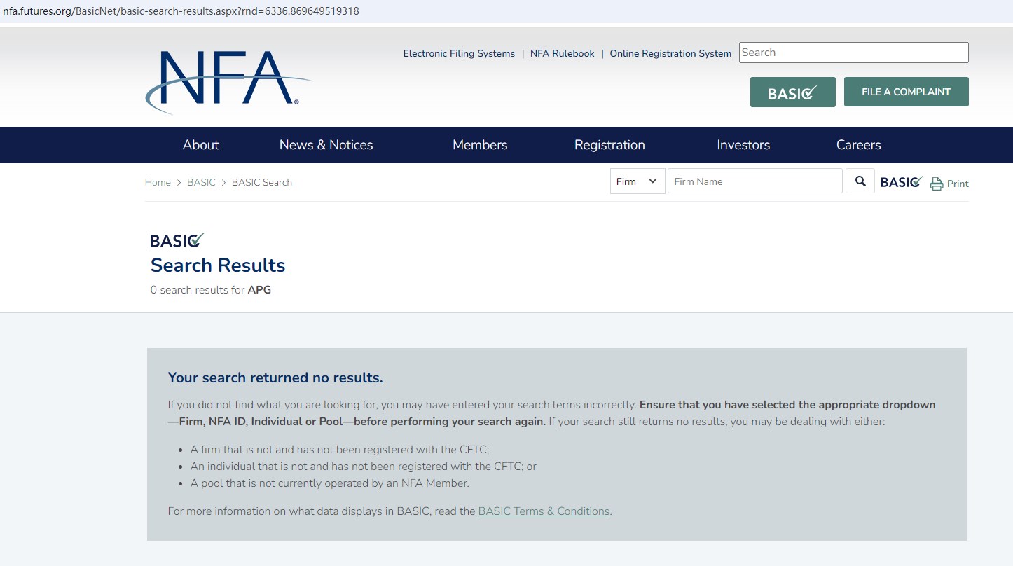 Upon investigation, APG PRIME is not authorized and regulated by the NFA.