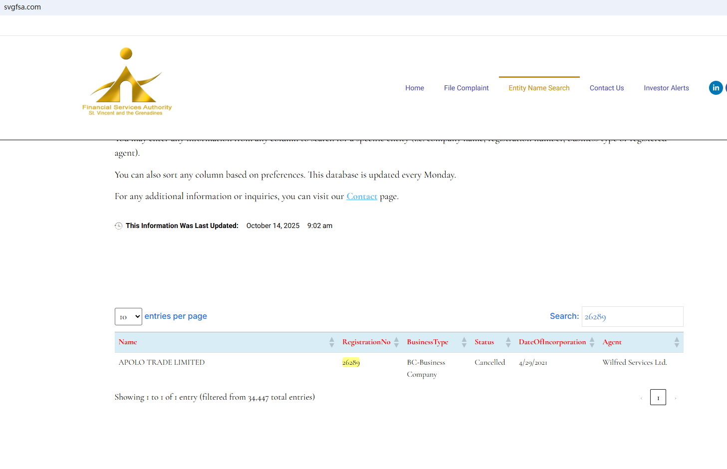 BrokersView found that the domain "https://apolotrade.website/" is currently inaccessible. APOLO Trading previously claimed to be registered with the St. Vincent and the Grenadines Financial Services Authority (SVG FSA), a search reveals its registration as "canceled." Entrusting investor funds to this company is extremely risky due to the lack of legal safeguards. APOLO Trading is a scam.