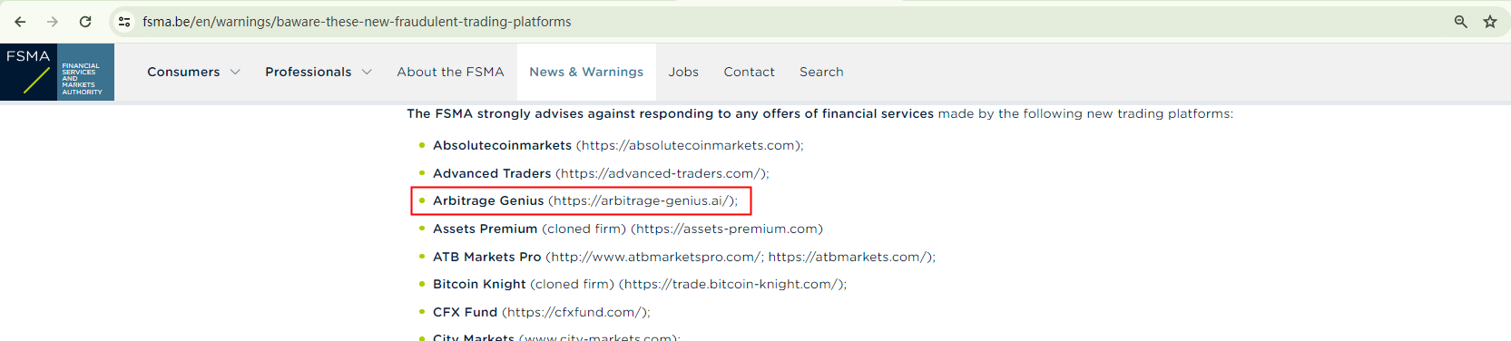 Moreover, the Belgian Financial Services and Markets Authority (FSMA) has flagged Arbitrage Genius as a potentially fraudulent trading platform, adding it to their warning list.