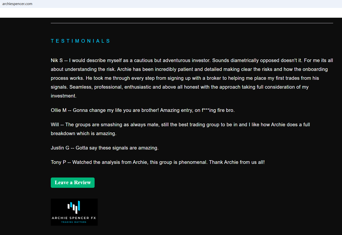 On Jun 4, 2025, the Financial Conduct Authority (FCA) issued a warning against Archie Spencer FX, believing this company might be providing financial services or products without proper authorization in the UK. https://www.fca.org.uk/news/warnings/wwwarchiespencercom-archiespencerfx