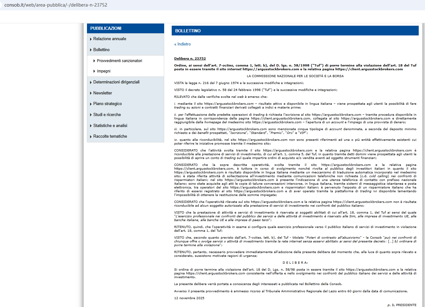 On Nov 12, 2025, the Italian Companies and Exchange Commission (CONSOB) ordered ArgusStockBrokers to be blacklisted for offering financial services illegally in Italy. https://www.consob.it/web/area-pubblica/-/delibera-n-23752