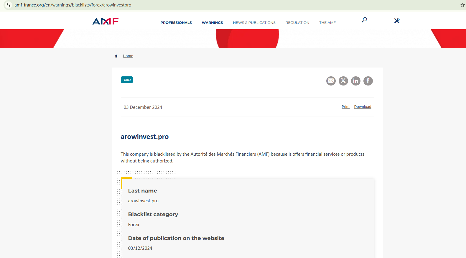 On December 3, 2024, the Financial Authority (Autorité des Marchés Financiers, AMF) added Arowinvest to warning list for it being an unauthorized company engaging in forex activities. https://www.amf-france.org/en/warnings/blacklists/forex/arowinvestpro