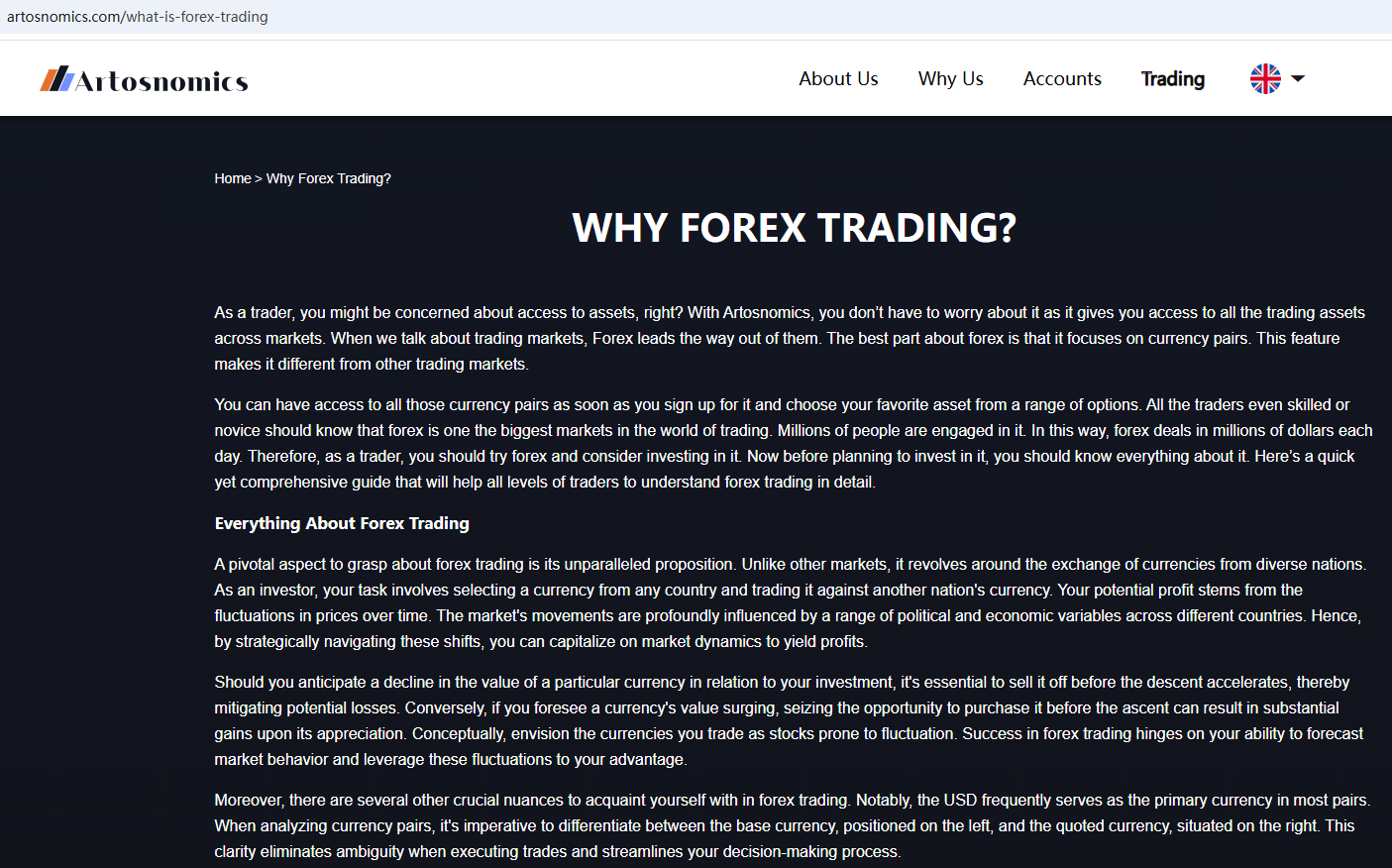 Artosnomics claims to be a trading platform located in the United Kingdom, offering a range of investment products to traders, including Forex, Cryptos and more instruments for trading in global markets. But there is no detailed financial services licenses and other licensing certificates. A company that offers financial services must have financial license in the country where it is located.
