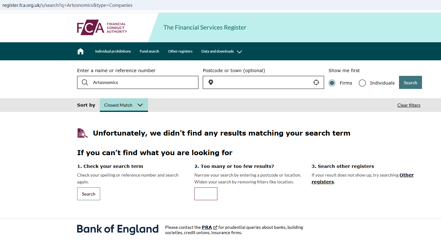 Upon investigation, we found that Artosnomics is not authorized and regulated by the United Kingdom Financial Conduct Authority (FCA).