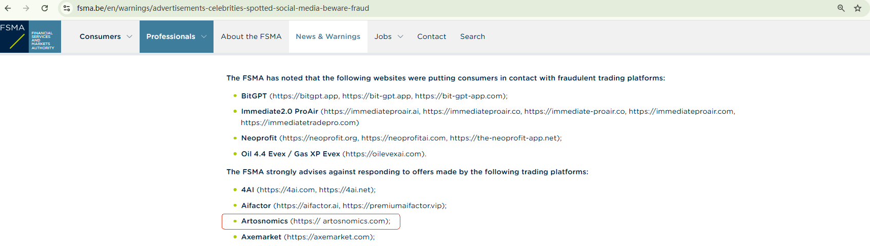 On November 15, 2024, the Belgian Financial Services and Markets Authority (FSMA) added Artosnomics to its warning list as a fraudulent trading platform operating in the Belgian market and advised investors to stay away from it. https://www.fsma.be/en/warnings/advertisements-celebrities-spotted-social-media-beware-fraud