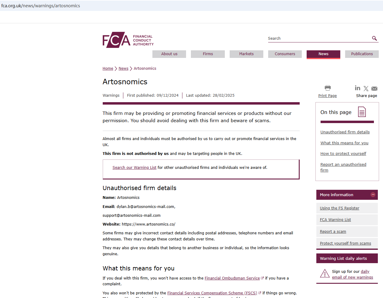 On February 28, 2025, the Financial Conduct Authority (FCA) issued a warning against Artosnomics, believing this company might be providing financial services or products without proper authorization in the UK. https://www.fca.org.uk/news/warnings/artosnomics