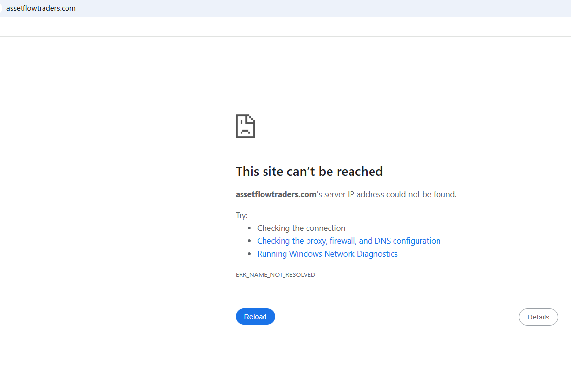 BrokersView found that the domain "https://assetflowtraders.com/" is currently inaccessible. This is widely regarded as a significant red flag, as the suspension of a broker's website often points to underlying regulatory or operational issues.