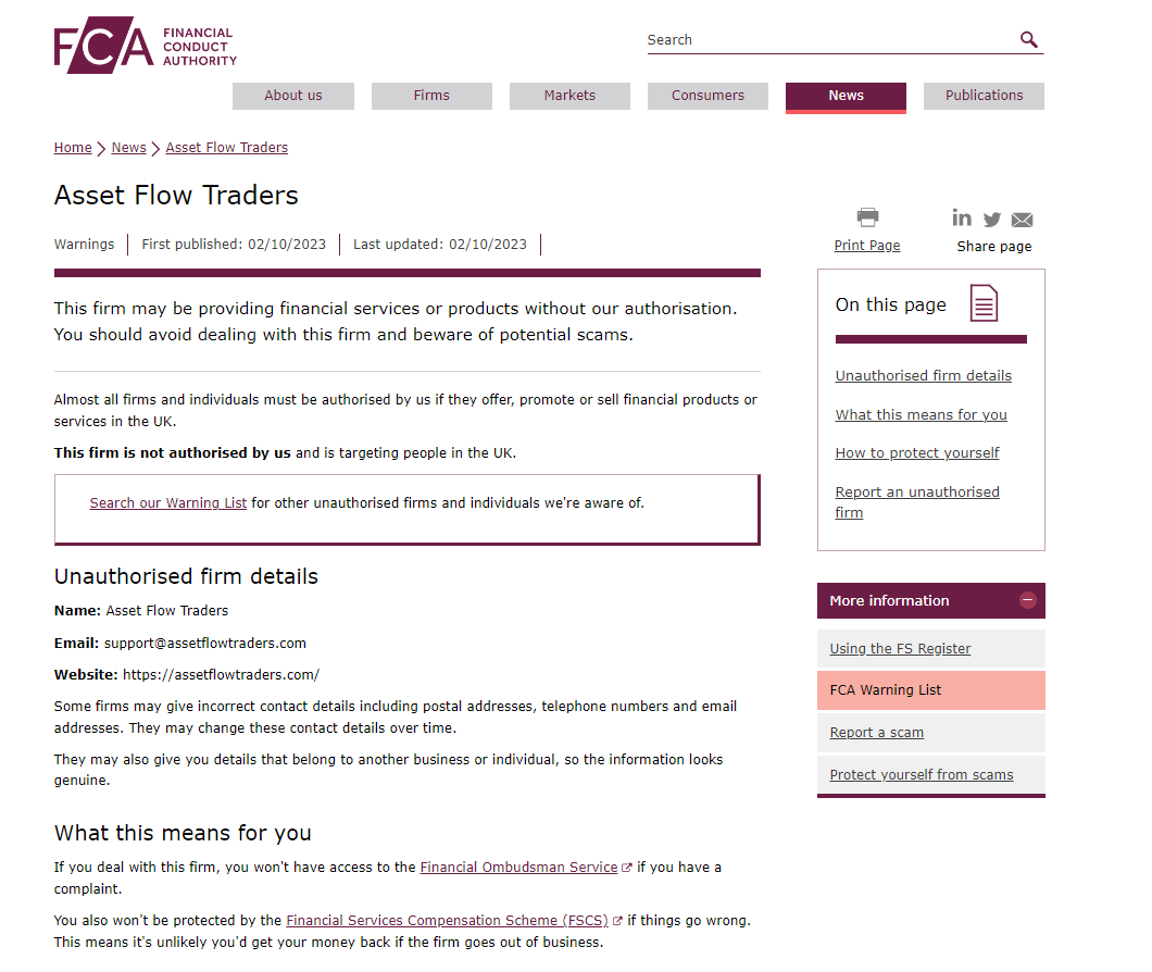 On 2 Oct 2023, the United Kingdom Financial Conduct Authority (UK FCA) issued a warning that Asset Flow Traders was providing financial services or products in the UK without authorisation. You may visit: https://www.fca.org.uk/news/warnings/asset-flow-traders
