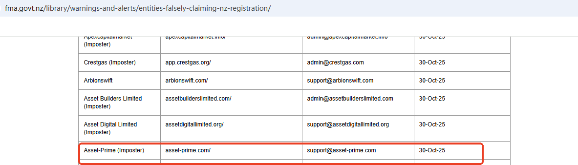 On Oct 30, 2025, the New Zealand Financial Markets Authority (NZ FMA) added AssetPrime to its warning list, stating that this is a fake investment platform. https://www.fma.govt.nz/library/warnings-and-alerts/entities-falsely-claiming-nz-registration/