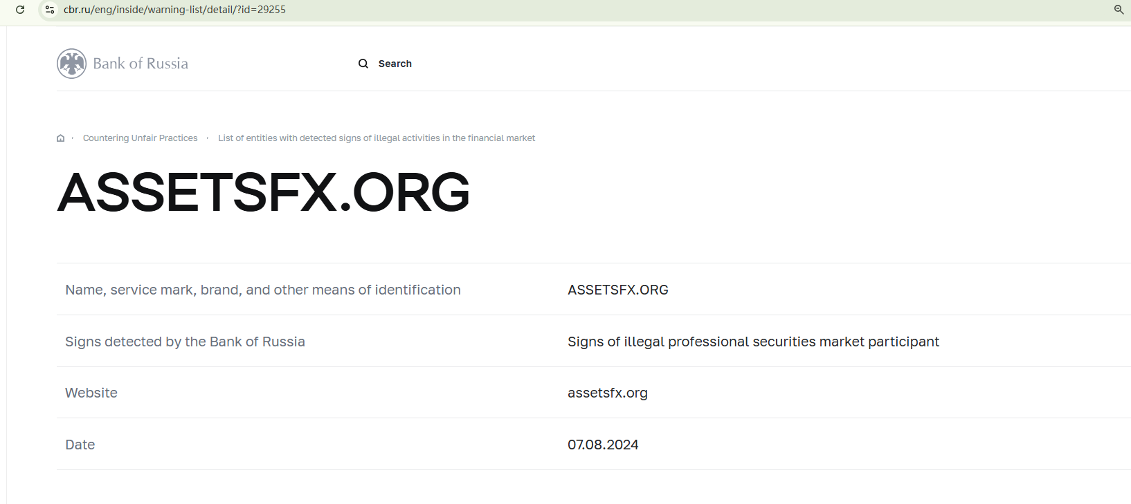 On August 7, 2024, the Central Bank of Russia (CBR) included Assets FX to its warning list for having signs of illegal professional securities market participant. https://www.cbr.ru/eng/inside/warning-list/detail/?id=29255