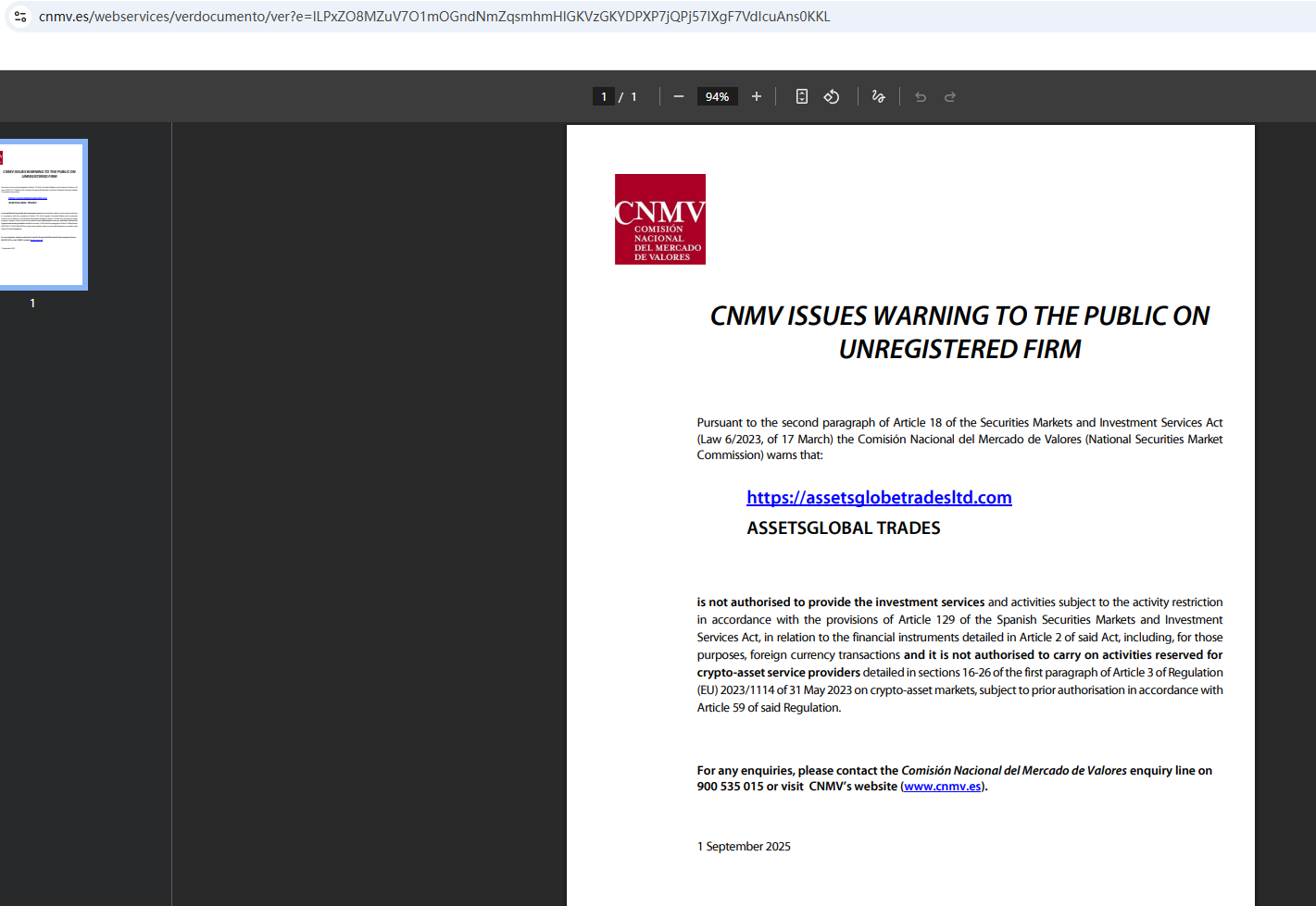 On Sept 1, 2025, the National Securities Market Commission (CNMV) issued a warning against ASSETSGLOBAL TRADES, believing this company might be providing financial services or products without proper authorization. https://www.cnmv.es/webservices/verdocumento/ver?e=lLPxZO8MZuV7O1mOGndNmZqsmhmHlGKVzGKYDPXP7jQPj57IXgF7VdIcuAns0KKL