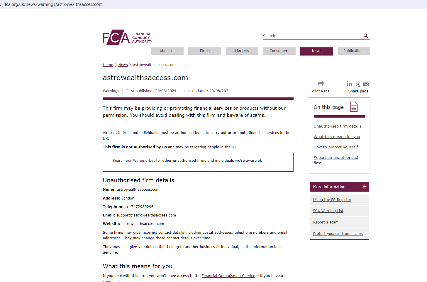In addition, the Financial Conduct Authority (FCA) issued a warning against Astrowealthsaccess, believing this company might be providing financial services or products without proper authorization in the UK.