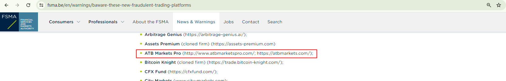 In addition, the Belgian Financial Services and Markets Authority (FSMA) has added ATB Markets Pro to its warning list as a fraudulent trading platform.