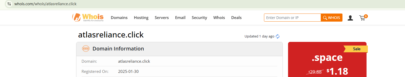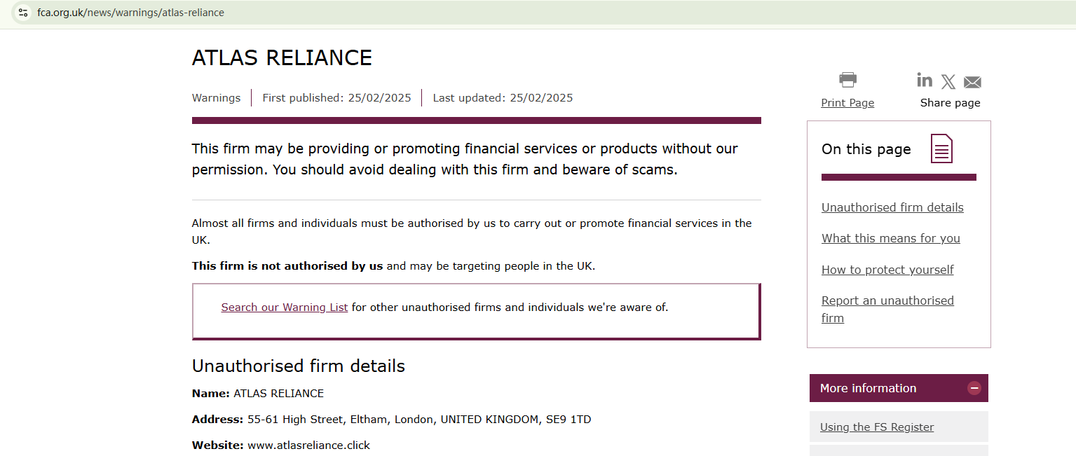 The domain name of ATLAS RELIANCE was just registered at the end of January 2025. It uses a website template for a quick setup, which is commonly associated with fraudulent trading activities. While the company claims to be regulated in the UK, the Financial Conduct Authority (FCA) has issued a warning, refuting such claims and advising investors to stay away from the unauthorized financial firm.