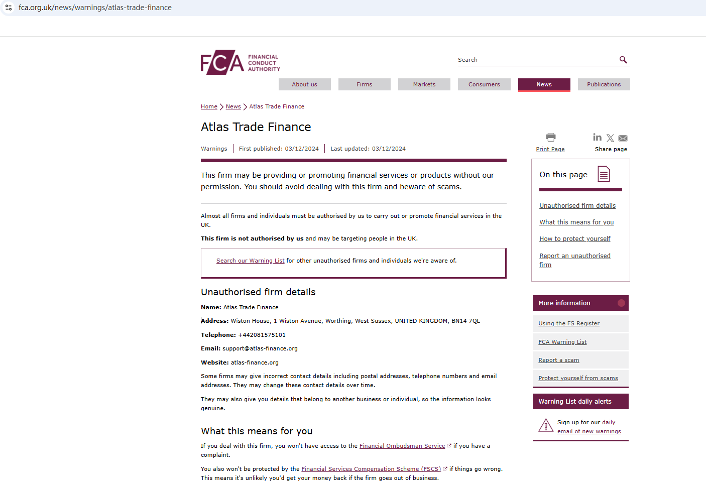 In addition, the Financial Conduct Authority (FCA) red-flagged Atlas Trade Finance as an unauthorized firm in the UK.