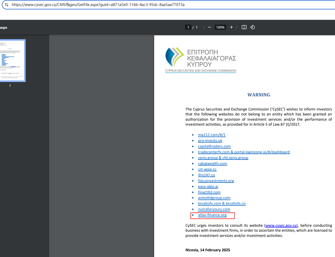 On 14 February 2025, the Cyprus Securities and Exchange Commission (CySEC) warned consumers about the services offered by the company Atlas Trade Finance, which is offering financial and investment services without the required authorization. https://www.cysec.gov.cy/CMSPages/GetFile.aspx?guid=a871a5e0-116b-4ac3-95dc-8aa5aa77073a