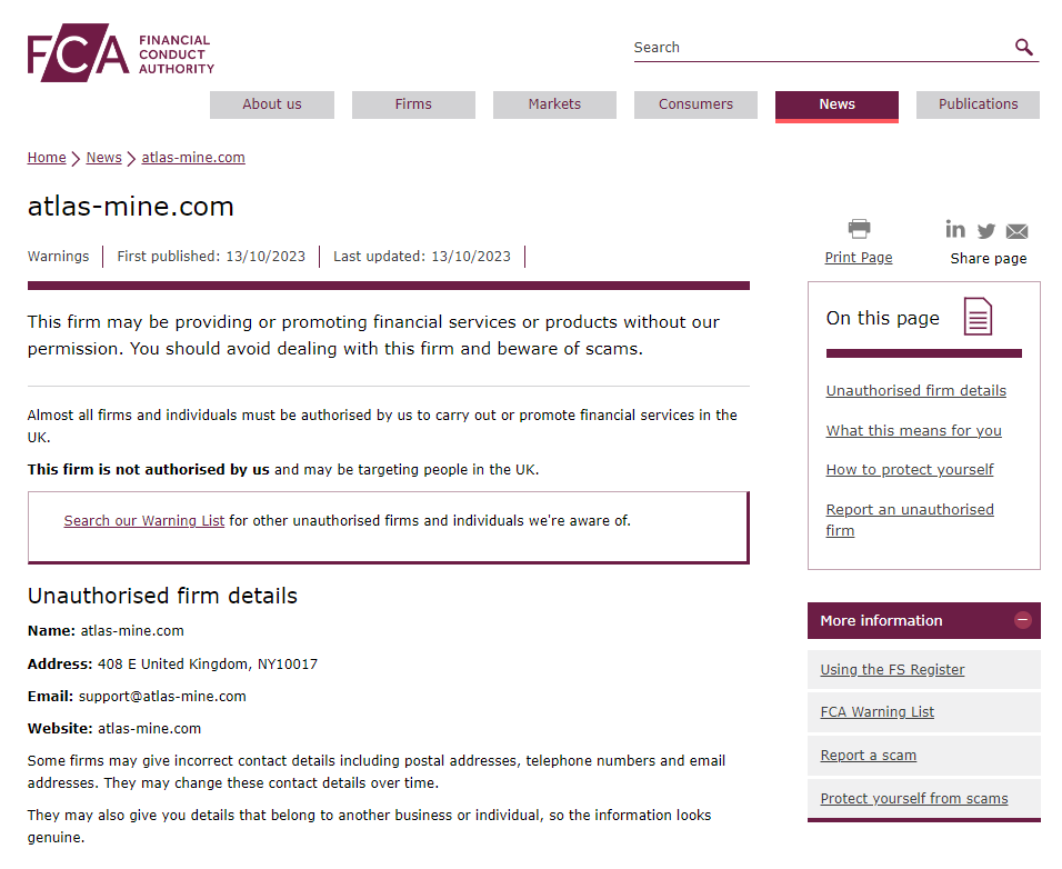 In addition, the United Kingdom Financial Conduct Authority (UK FCA) issued a warning that atlas-mine.com was providing finacial services or products without authorisation.