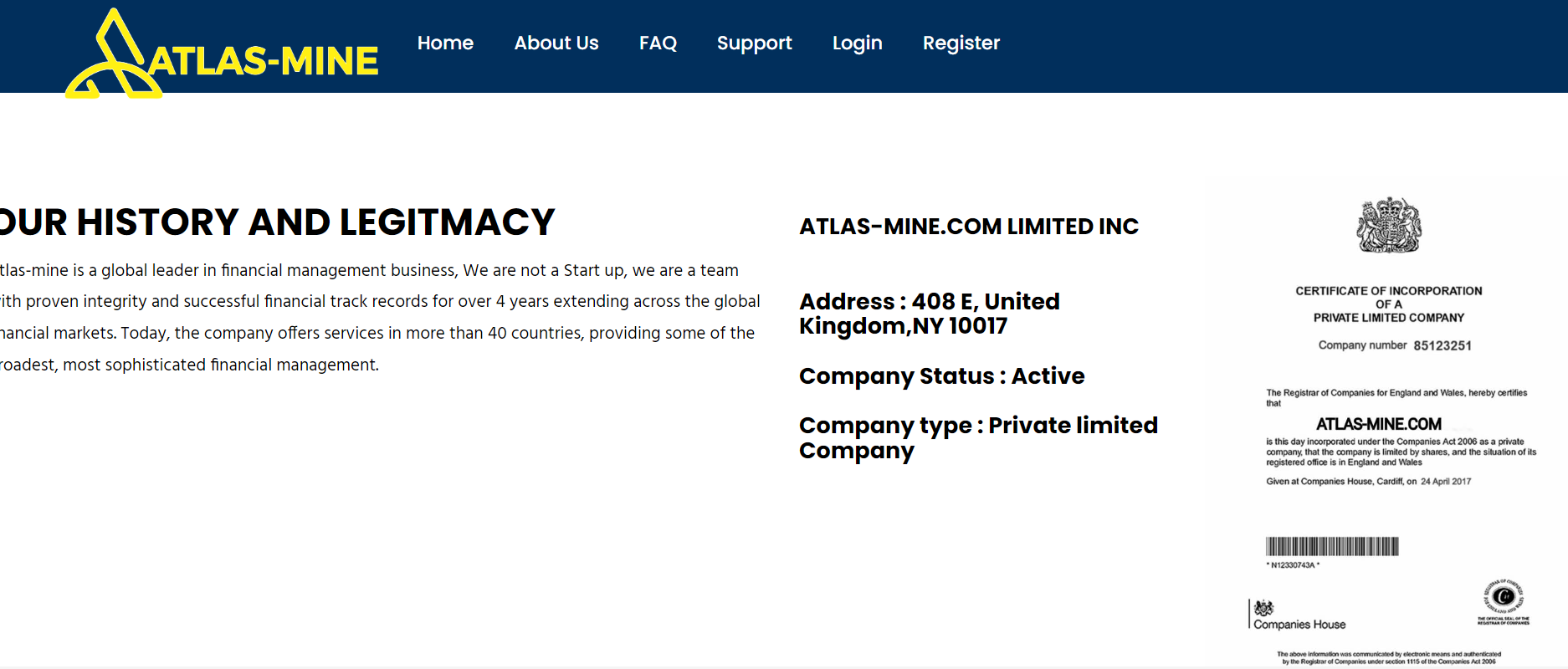atlas-mine.com claims to be regulated by Companies House(CH) with registeration number is 85123251, but there is no matching information was found in the regulator.