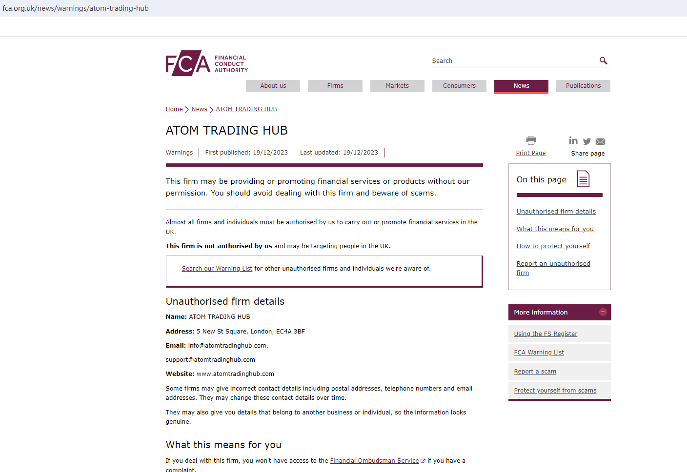 On 19 December 2023, the United Kingdom Financial Conduct Authority (UK FCA) issued a warning that ATOM TRADING HUB was providing financial services or products in the UK without authorisation. You may visit: https://www.fca.org.uk/news/warnings/atom-trading-hub