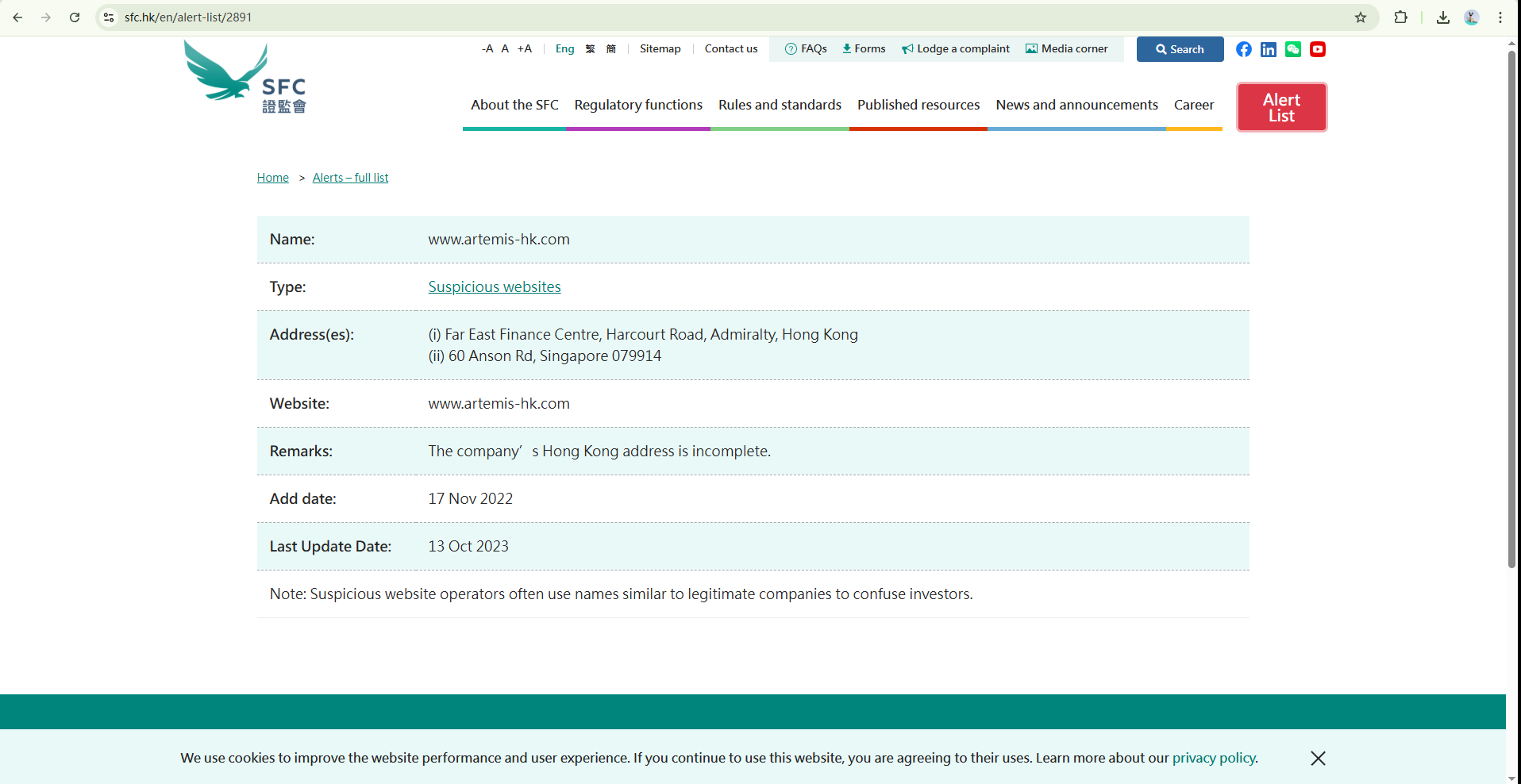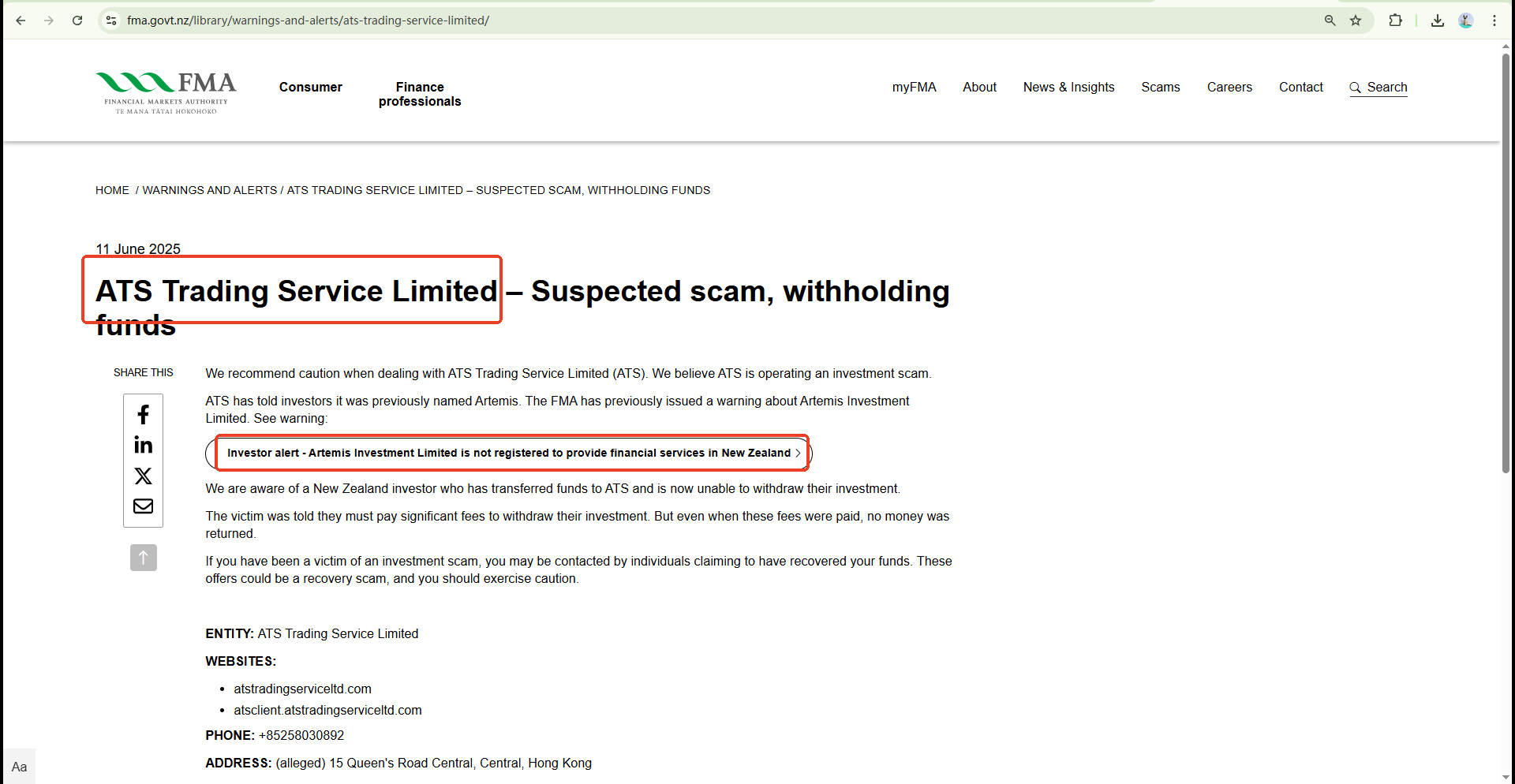 The Financial Markets Authority (FMA) of New Zealand has issued a warning about ATS, expressing concerns that the company may be running an investment scam. ATS has reportedly informed investors that it was previously known as Artemis, which was also placed on the Alert List of the Securities and Futures Commission (SFC) of Hong Kong. All of these red flags indicate that ATS is a fraud.