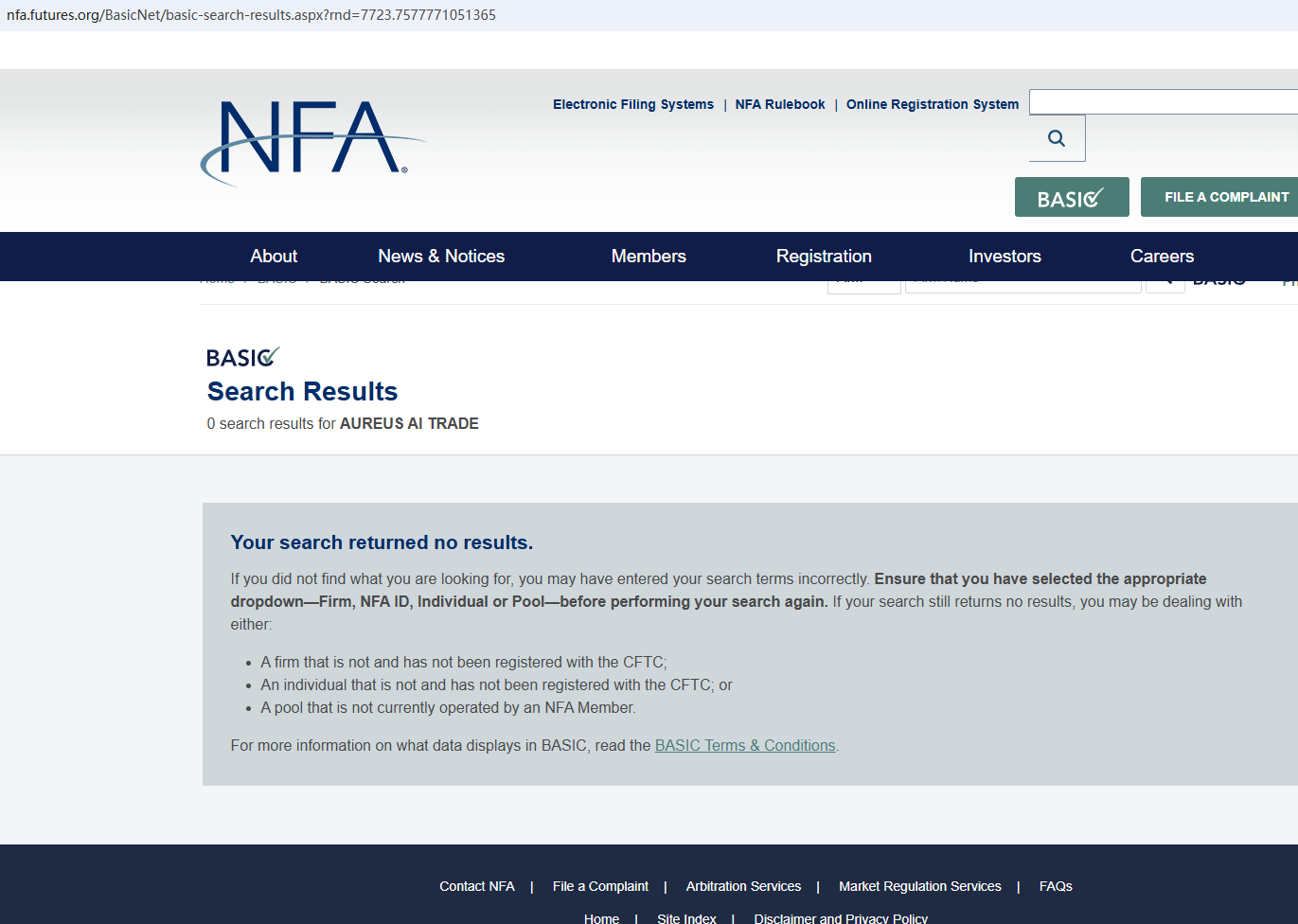 According to its website, it repeatedly emphasizes that it is subject to top global regulation, but it does not display a single piece of evidence of strong regulation on the website. It claims that its office is located in the United States, but after searching, no matching information was found in the National Futures Association (NFA). In addition, the Financial Conduct Authority (FCA) issued a warning regarding Aureus AI Trade, suspecting that this company may be offering financial services or products without the necessary authorization.