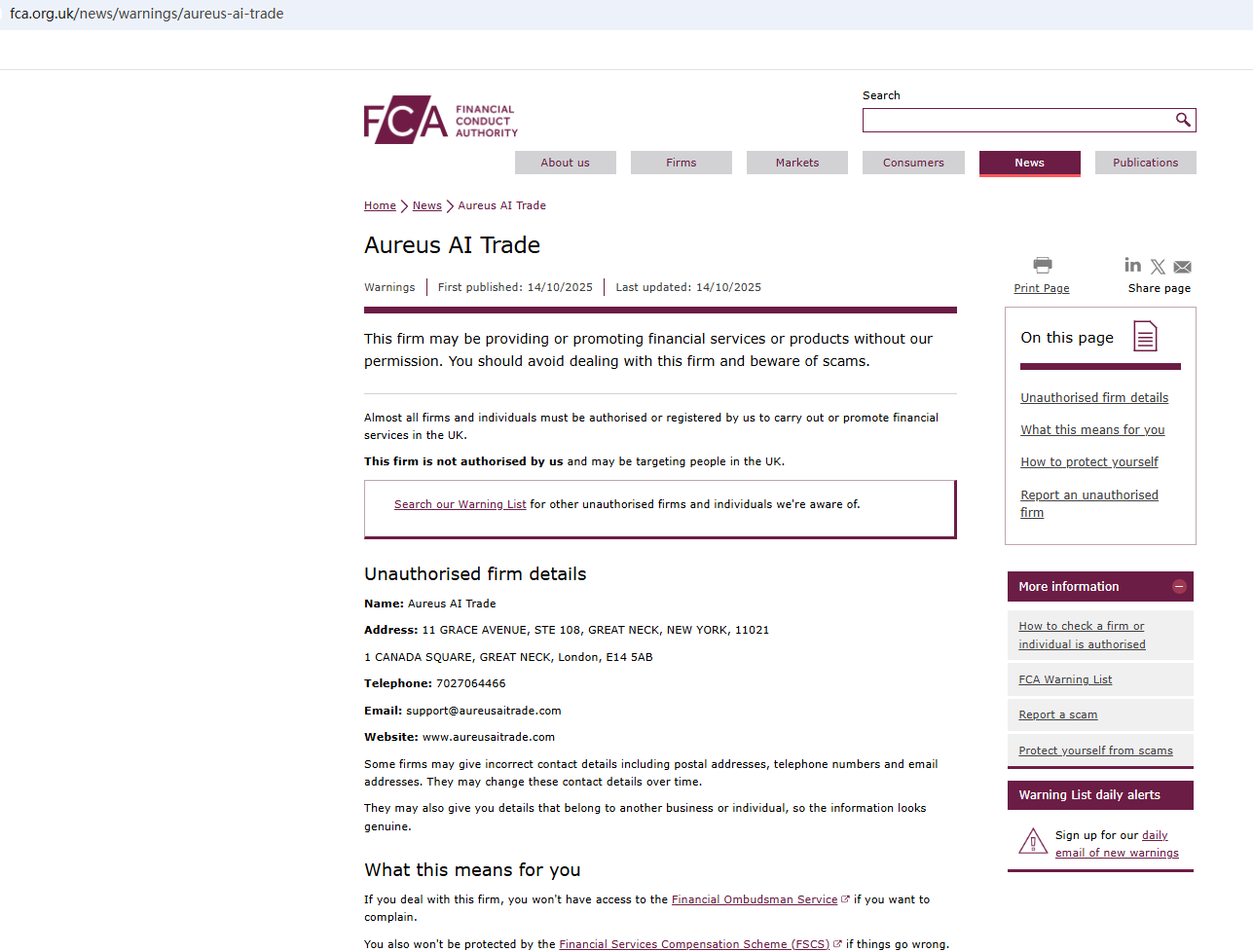 On Oct 14, 2025, the Financial Conduct Authority (FCA) issued a warning regarding Aureus AI Trade, suspecting that this company may be offering financial services or products without the necessary authorization. https://www.fca.org.uk/news/warnings/aureus-ai-trade