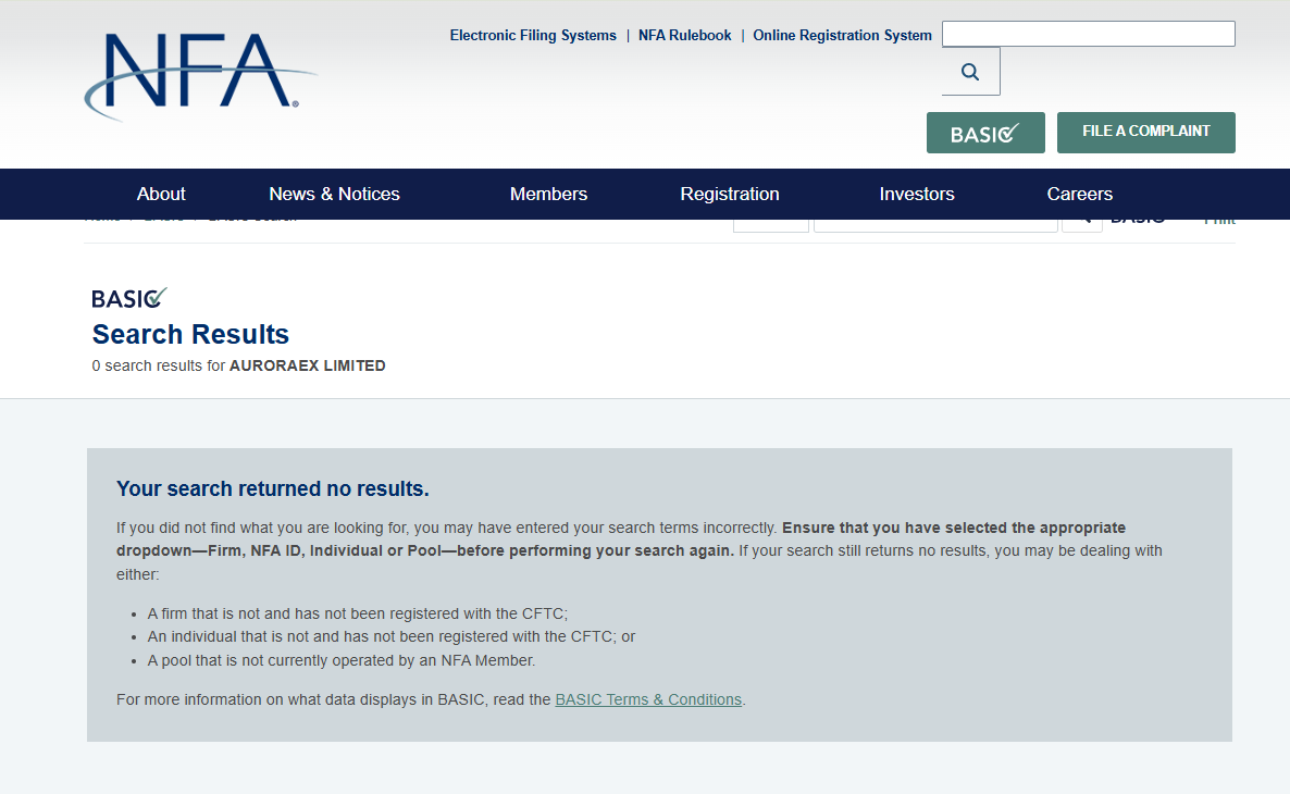 Furthermore, we have checked the registry of the National Futures Association (NFA), the primary regulatory body overseeing forex brokers in the United States, and AuroraEx Limited is not listed as an authorized or registered entity. This means the company is not licensed to conduct forex trading operations in the U.S.
