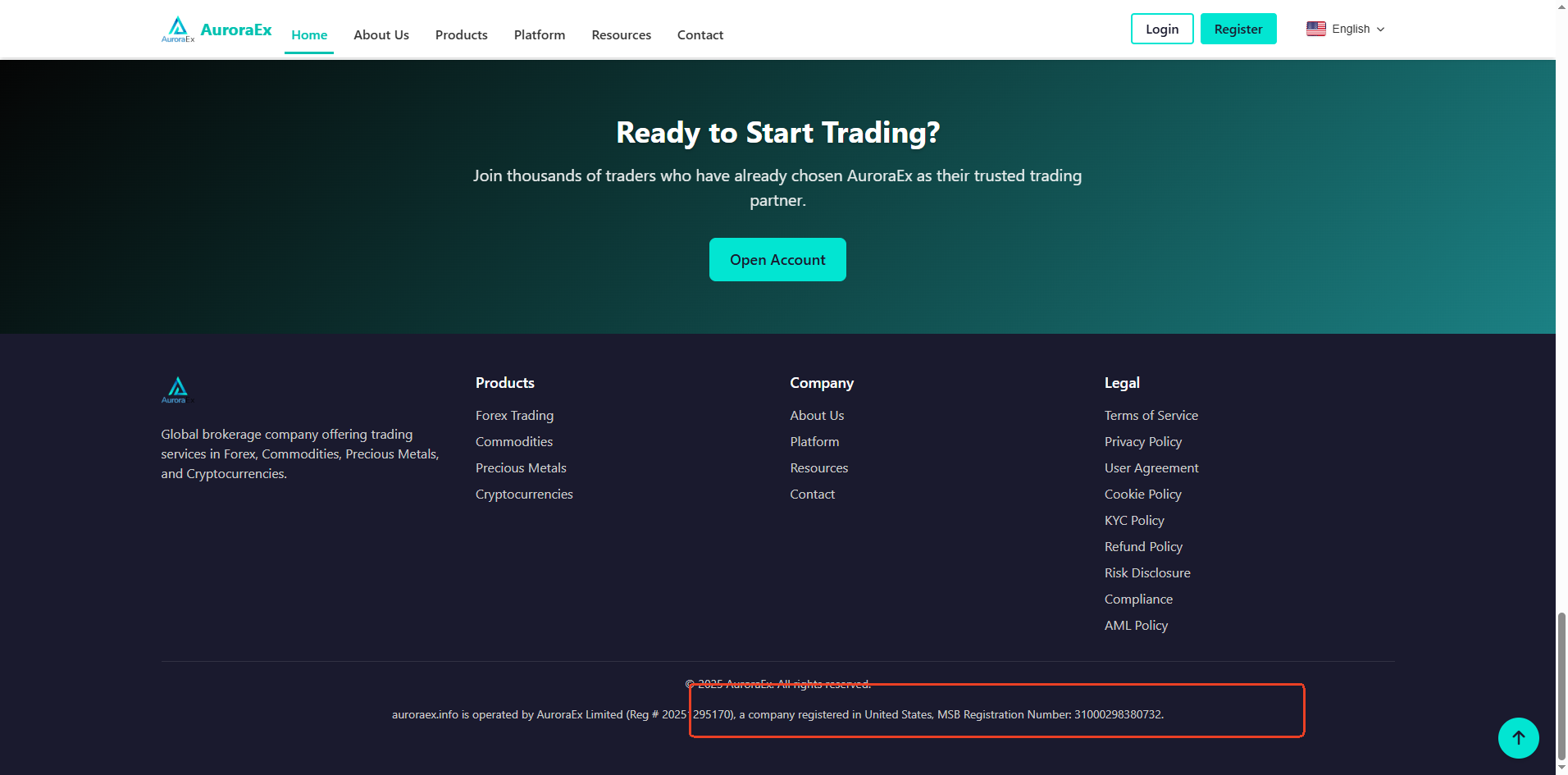 AuroraEx claims to be registered in the United States and holds a Money Services Business (MSB) registration with the number 31000298380732. While we have verified that this registration number is indeed assigned to AuroraEx Limited, it is crucial to understand that the issuing agency, the Financial Crimes Enforcement Network (FinCEN), does not regulate forex brokers or provide oversight for trading activities.