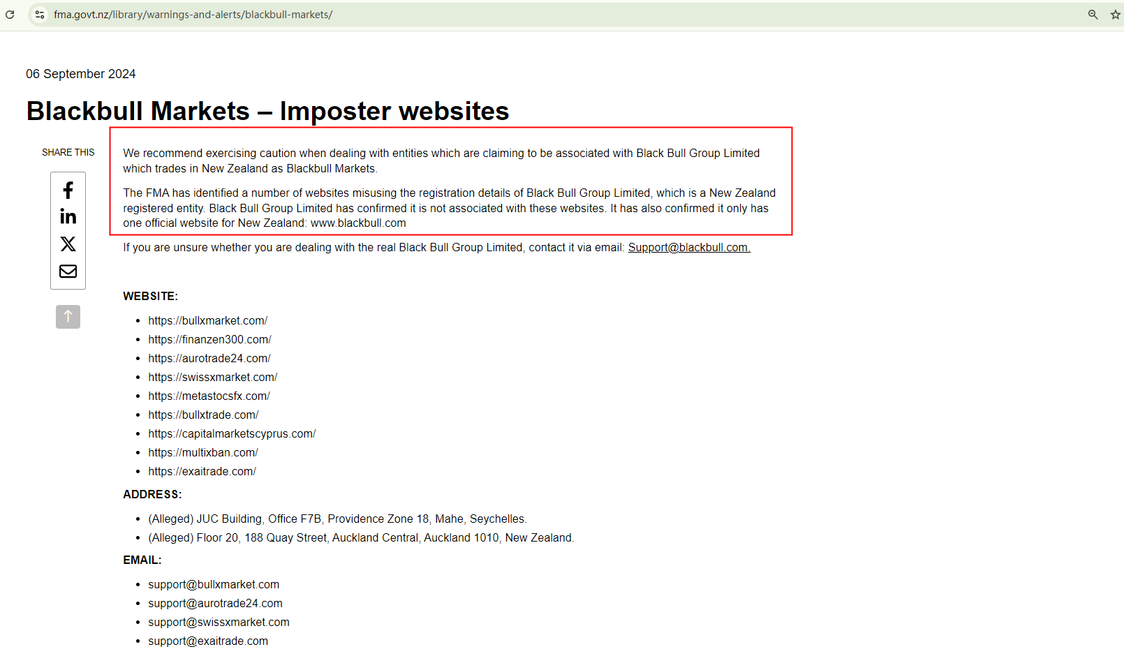 On Sep 6, 2024, the New Zealand Financial Markets Authority (NZ FMA) issued a warning about a list of imposter websites that falsely claim to be associated with Black Bull Group Limited. This blacklist includes Aurotrade24. https://www.fma.govt.nz/library/warnings-and-alerts/blackbull-markets/