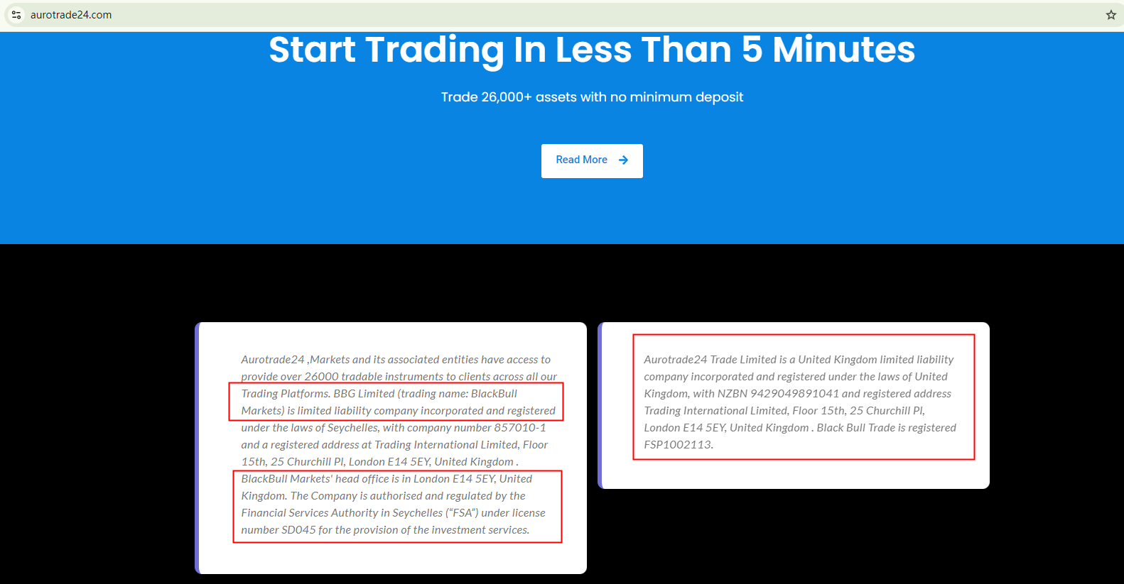 Aurotrade24 falsely claims to be associated with Black Bull Group Limited, which operates in New Zealand as Blackbull Markets. The New Zealand Financial Markets Authority (NZ FMA) has identified several websites, including Aurotrade24, that misuse the registration details of Black Bull Group Limited, a registered entity in New Zealand. Black Bull Group Limited has confirmed it is not associated with these websites. Therefore, Aurotrade24 is clearly a scam.
