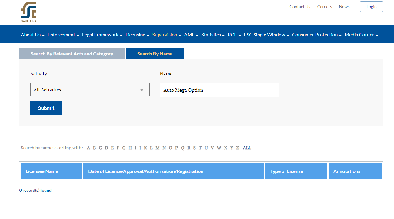 According to its website, Auto Mega Option claims to be regulated by the Mauritius Financial Services Commission (FSC). However, there is no matching information was found in the FSC.