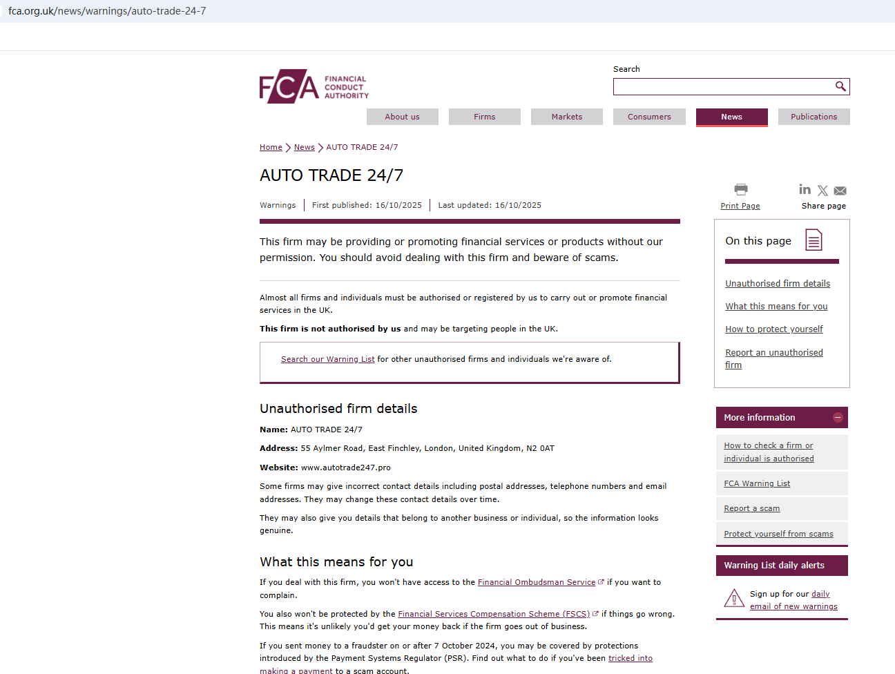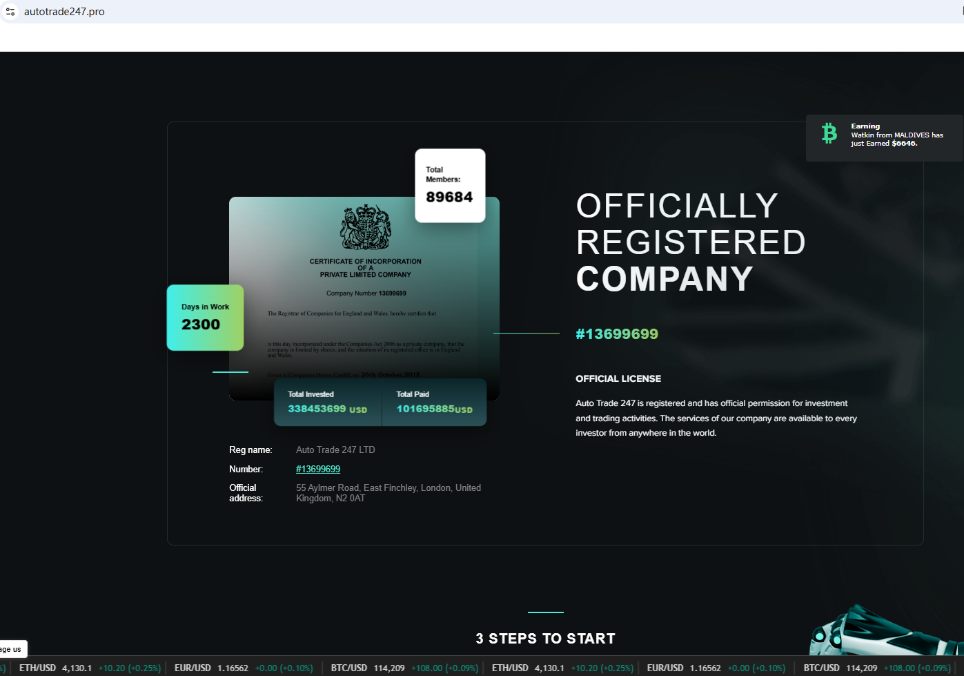 According to its website, the company claims to be reliable and provides a certificate from Companies House (CH). As we all know, CH only represents company registration and does not have the right to regulate foreign exchange. To obtain the right to exercise foreign exchange in the UK, it must be regulated by the FCA. Ironically, we found that the Financial Conduct Authority (FCA) issued a warning regarding AUTO TRADE 247, suspecting that this company may be offering financial services or products without the necessary authorization.