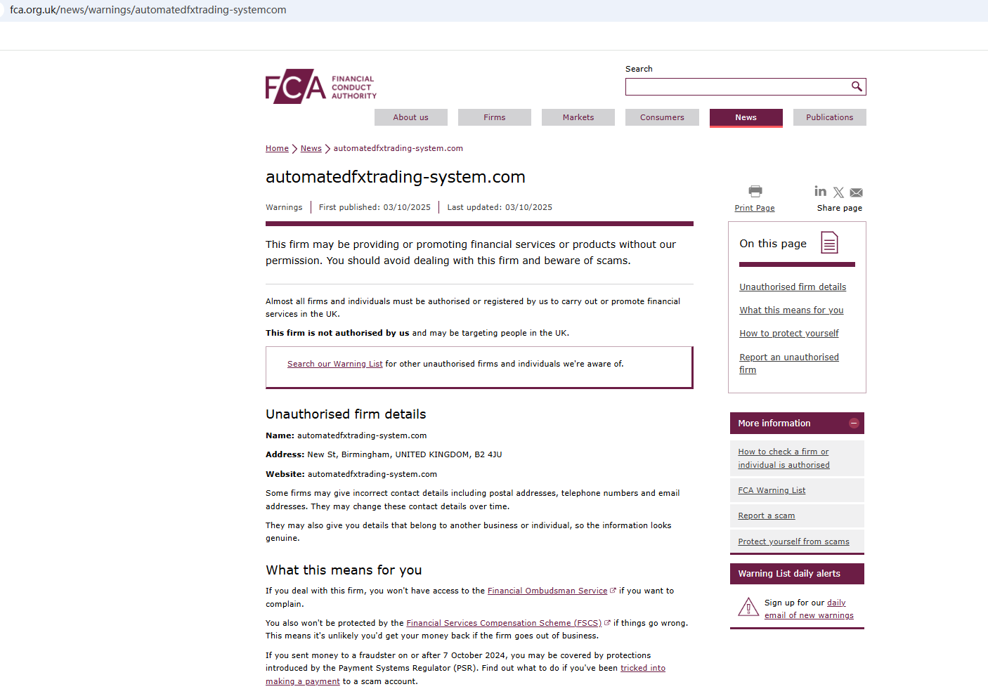 On Oct 3, 2025, the Financial Conduct Authority (FCA) issued a warning regarding automatedfxtrading system.com, suspecting that this company may be offering financial services or products without the necessary authorization. https://www.fca.org.uk/news/warnings/automatedfxtrading-systemcom