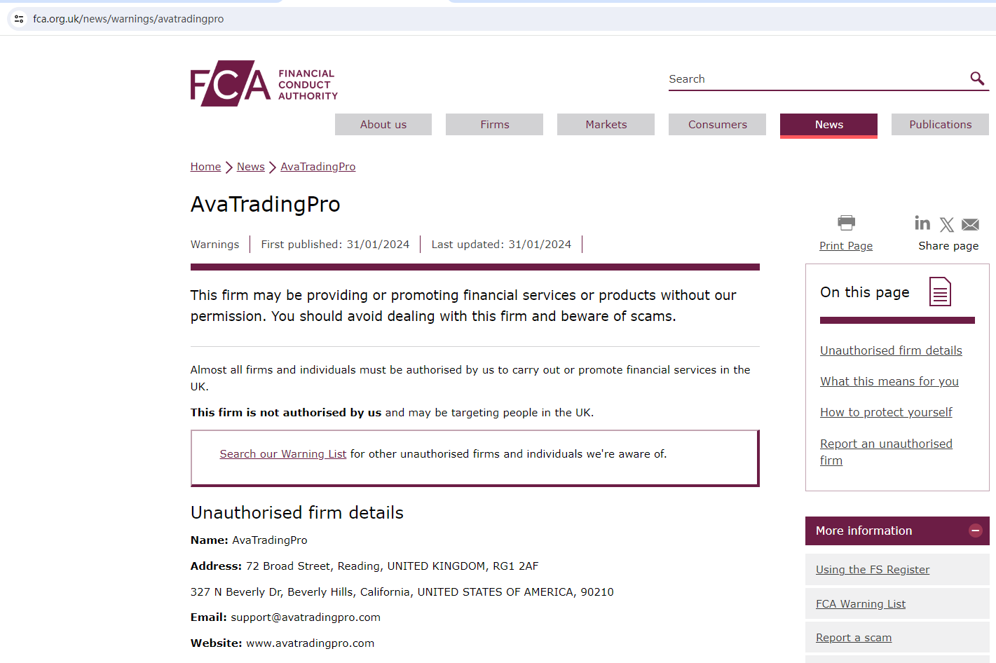 On 31 January 2024, the United Kingdom Financial Conduct Authority (UK FCA) issued a warning that AvaTradingPro was providing financial services or products in the UK without authorisation. You may visit: https://www.fca.org.uk/news/warnings/avatradingpro