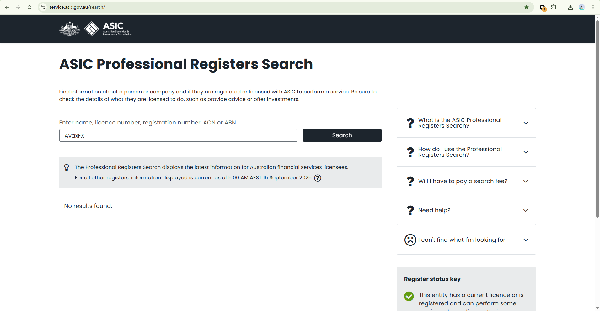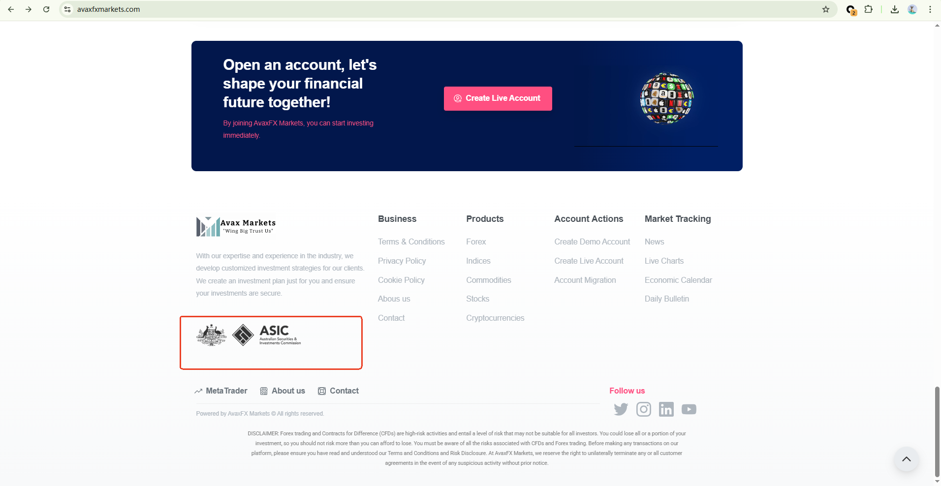 AvaxFX Markets' website does not clearly state any regulatory oversight, but it displays the logo of the Australian Securities and Investments Commission (ASIC) in the footer, which may mislead users into believing it is regulated. However, our search of ASIC’s official database found no record of AvaxFX Markets, raising serious concerns about potential false representation.