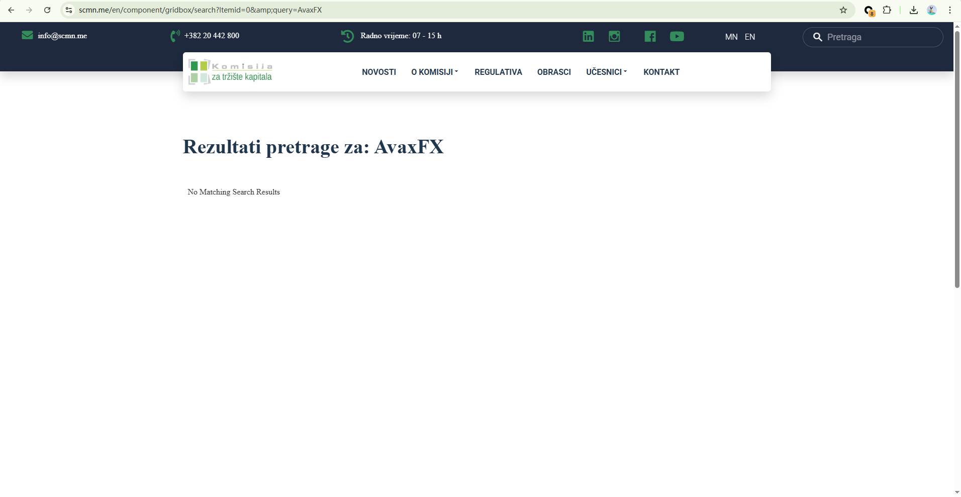 Additionally, while the platform claims to be based in Montenegro, we have also searched the registry of the Securities Commission of Montenegro (SCMN) and found no matching entity. This further confirms that AvaxFX Markets is not authorized or supervised by any recognized financial regulatory authority.