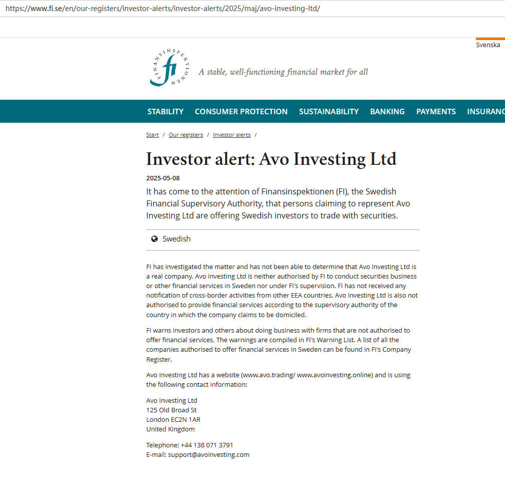 On May 8, 2025, the Finansinspektionen (FI) issued a warning against Avo Investing Ltd, suspecting that it is not a real company. https://www.fi.se/en/our-registers/investor-alerts/investor-alerts/2025/maj/avo-investing-ltd/