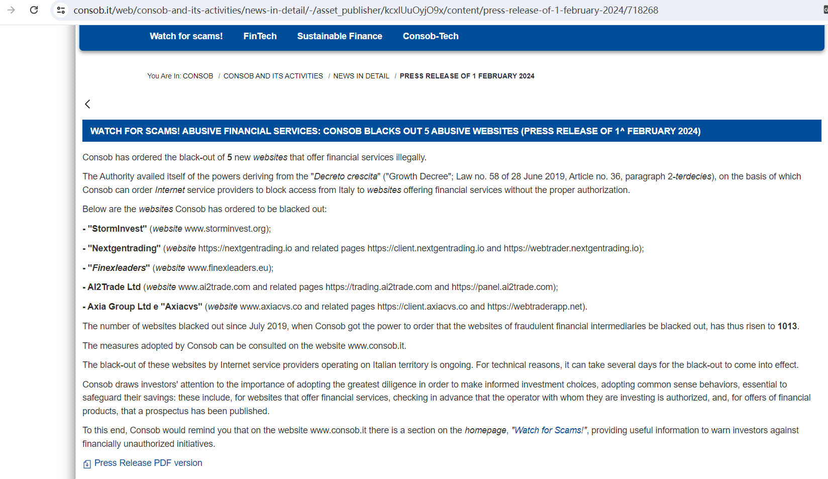 On Feb 1, 2024, the Commissione Nazionale per le Società e la Borsa (CONSOB) ordered the blackout of Axiacvs' website. https://www.consob.it/web/consob-and-its-activities/news-in-detail/-/asset_publisher/kcxlUuOyjO9x/content/press-release-of-1-february-2024/718268