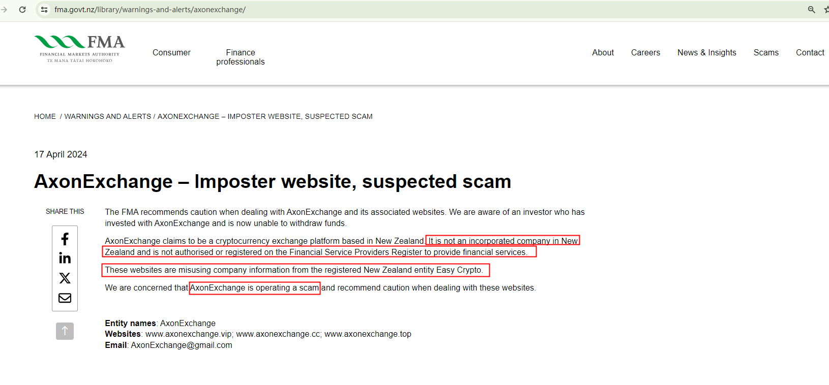 On April 17, 2024, the New Zealand Financial Markets Authority (FMA) issued a warning against AxonExchange, stating that this company is not registered or licensed to provide its services to New Zealand residents and suspecting it as a scam. https://www.fma.govt.nz/library/warnings-and-alerts/axonexchange/