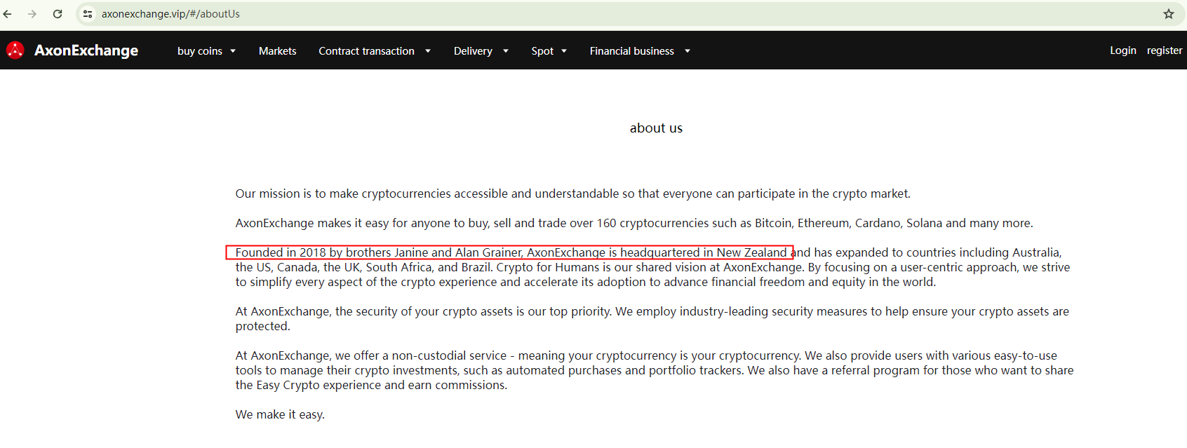 The company purports to be registered in New Zealand. However, the New Zealand Financial Markets Authority (FMA) has sounded an alarm regarding AxonExchange. The authority asserts that the company is not only unregistered in the country, but it also misappropriates information from Easy Crypto, a legitimately registered New Zealand entity, to swindle investors. Consequently, the NZ FMA has identified all three associated websites as fraudulent and suspects them of being scams.