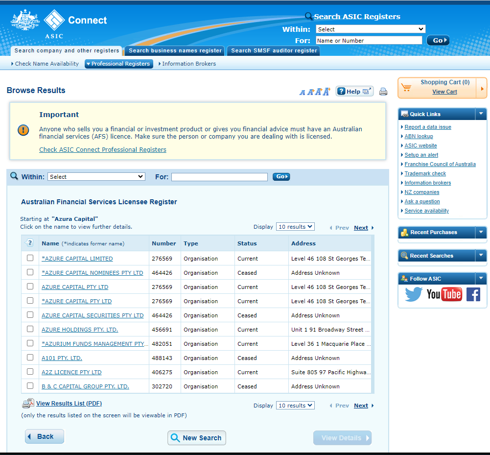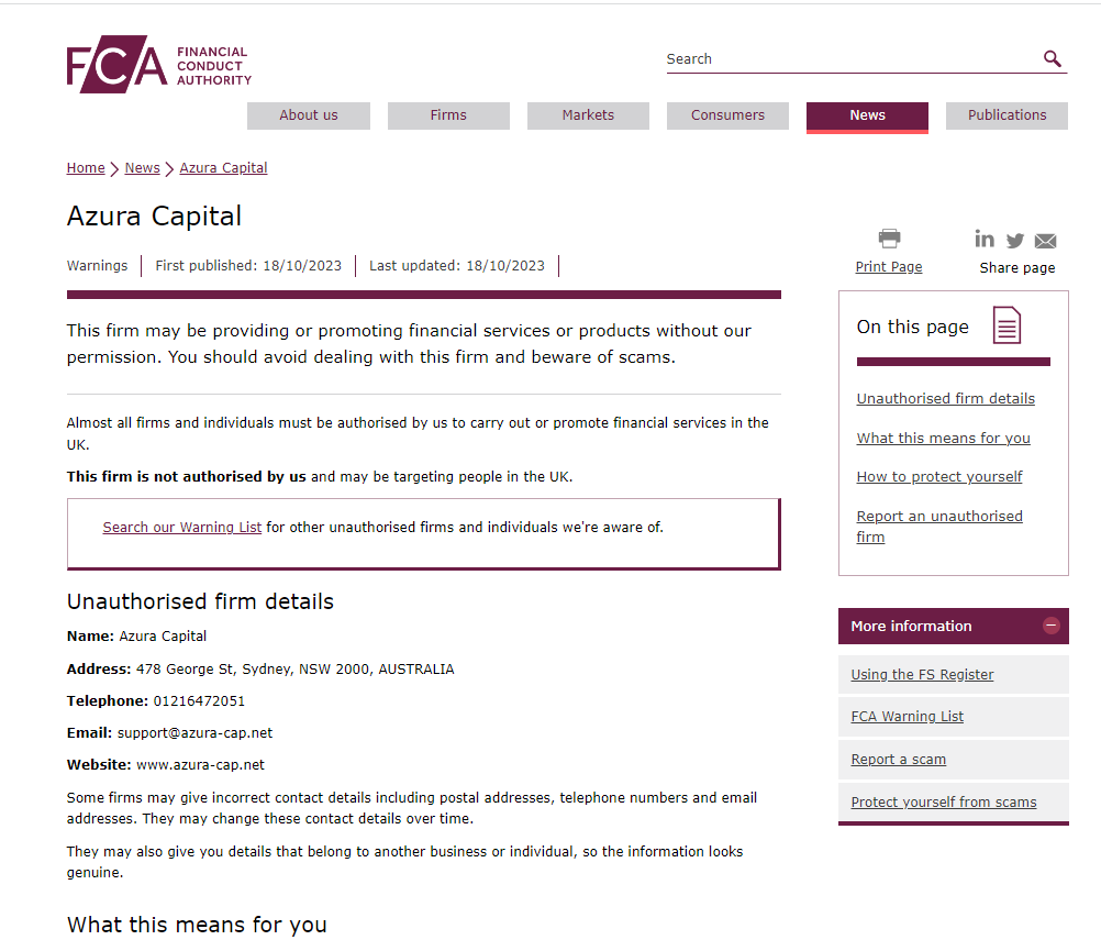 In addition, the United Kingdom Financial Conduct Authority (UK FCA) issued a warning that Azura Capital was providing finacial services or products without authorisation.