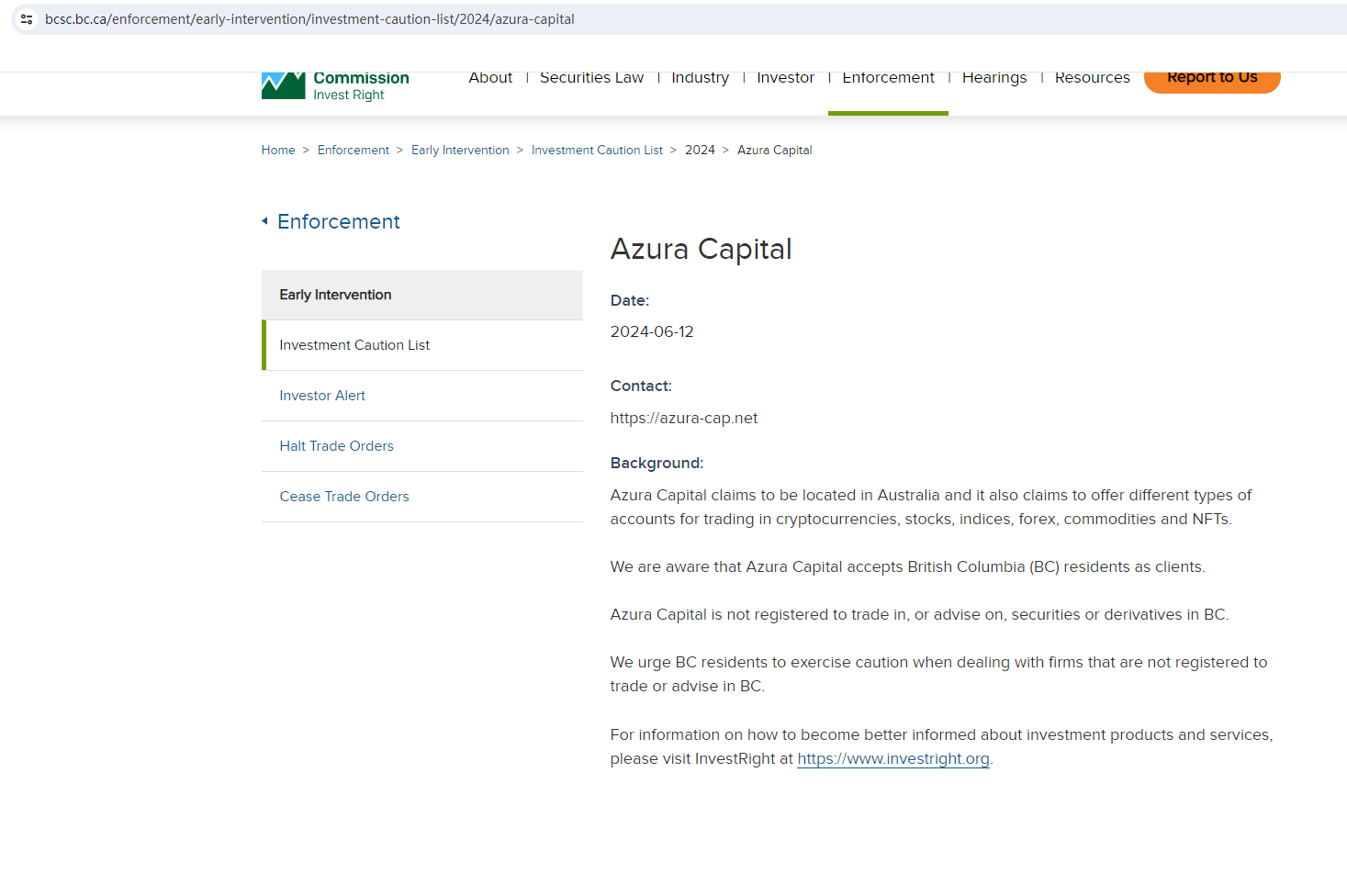 On 12 Jun 2024, the British Columbia Securities Commission (BCSC) issued a warning that Azura Capital was providing financial services or products without authorisation. You may visit: https://www.bcsc.bc.ca/enforcement/early-intervention/investment-caution-list/2024/azura-capital