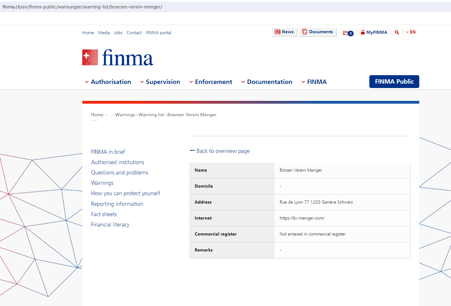 According to its website, it is located in the Switzerland. Upon investigation, we found that the Swiss Financial Market Supervisory Authority (FINMA) issued a warning against Börsen Verein Menger stating that this broker is not supervised.