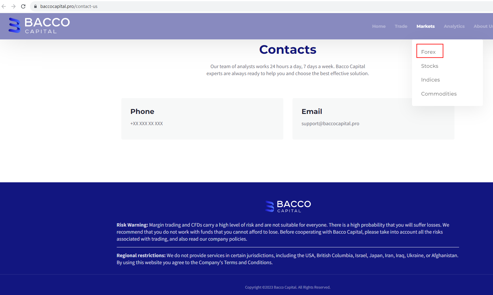 Bacco Capital claims to be a reliable company without presenting any information about its regulation or contact. The lack of such important information may be a distinct signal of an unlicensed broker, as regulated companies always present their accreditations and licenses in a prominent position. It is a red flag.