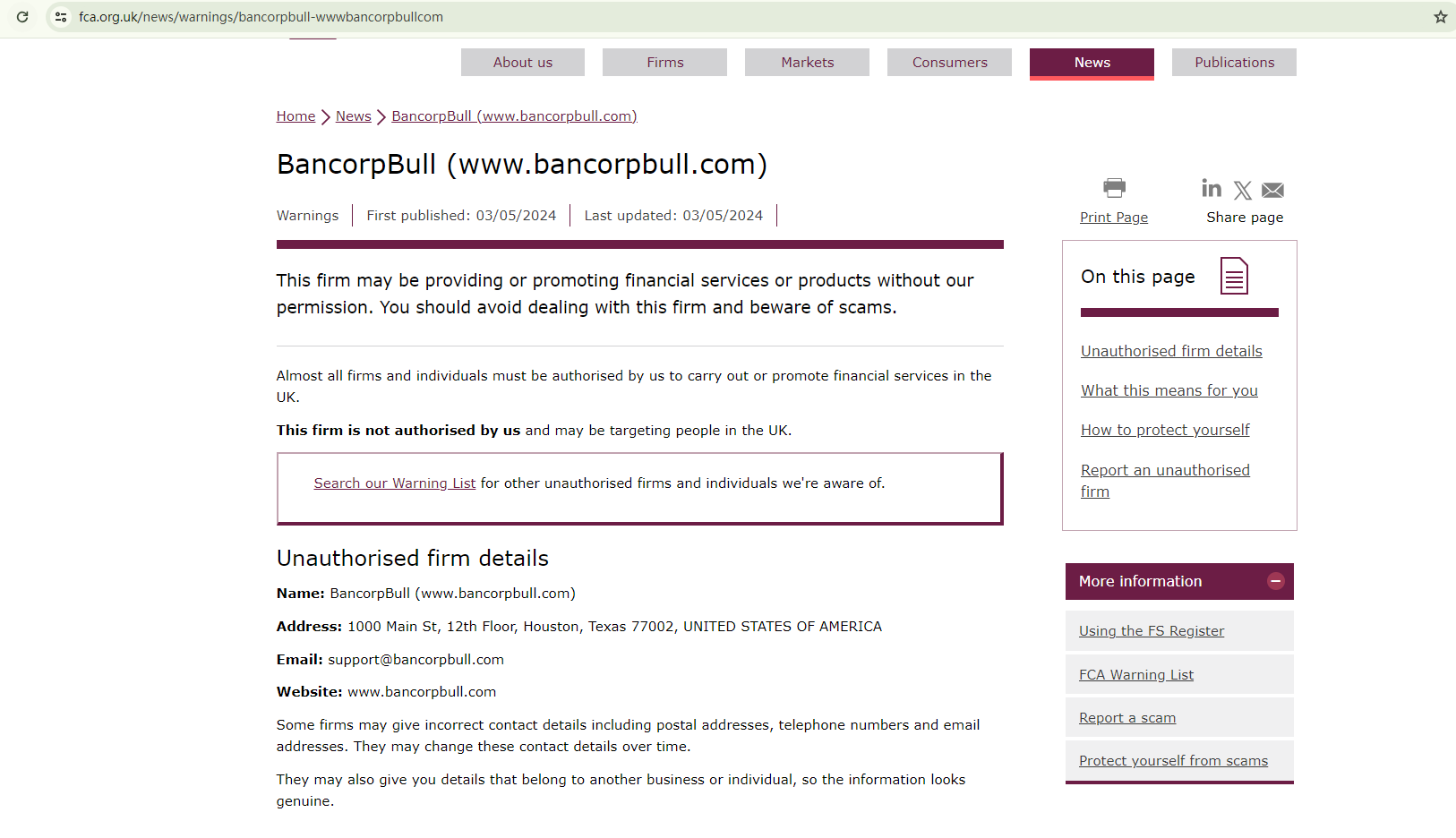 On May 3rd, 2024, the Financial Conduct Authority (FCA) issued a warning against BancorpBull, believing this company might be providing financial services or products without proper authorization in the UK. https://www.fca.org.uk/news/warnings/bancorpbull-wwwbancorpbullcom