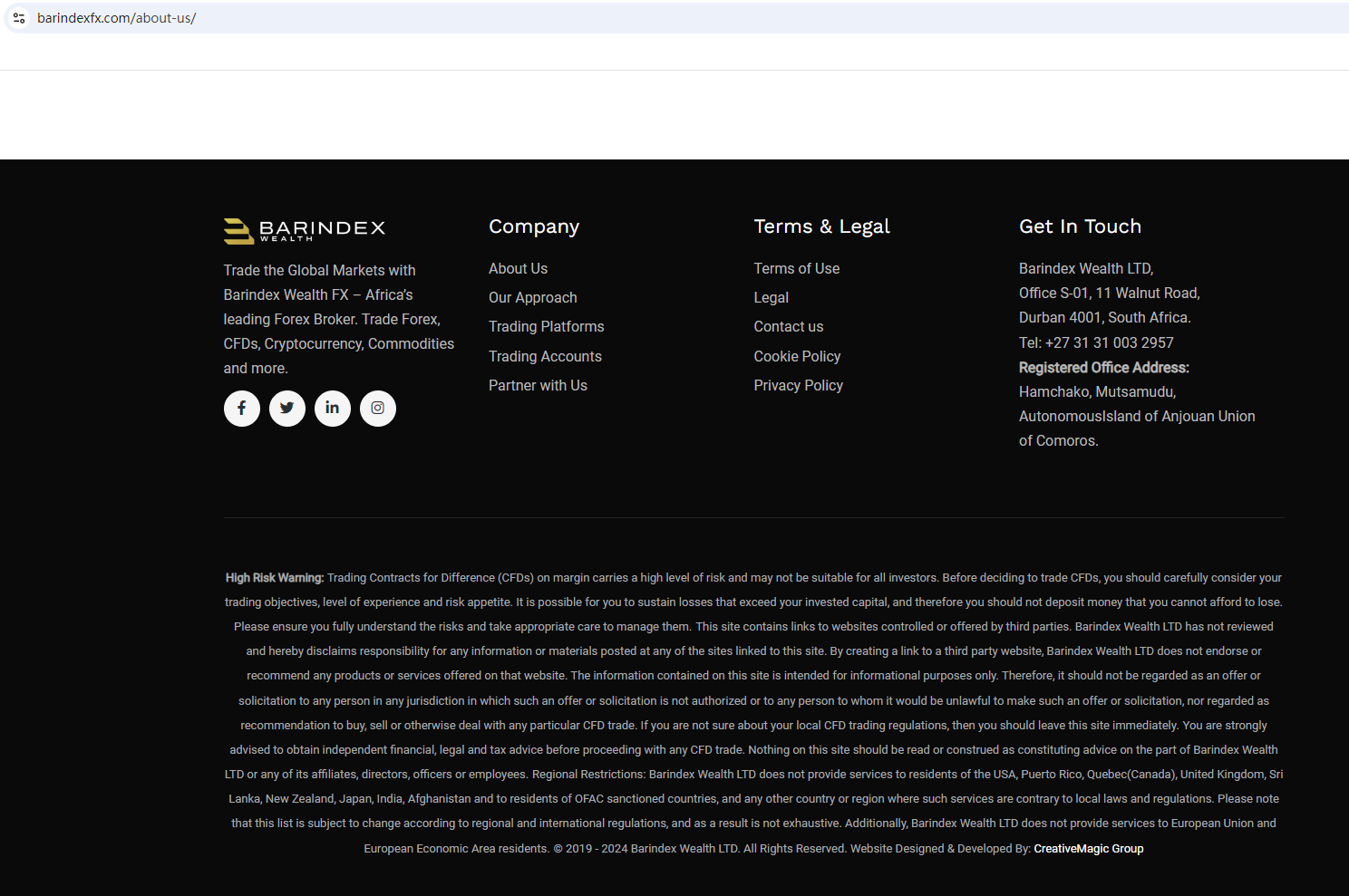 According to its website, it claims to be registered in the Comoros and has an address in South Africa. Upon investigation, no matching information was found in the MWALI INTERNATIONAL SERVICES AUTHORITY (MISA) and Financial Sector Conduct Authority (FSCA).