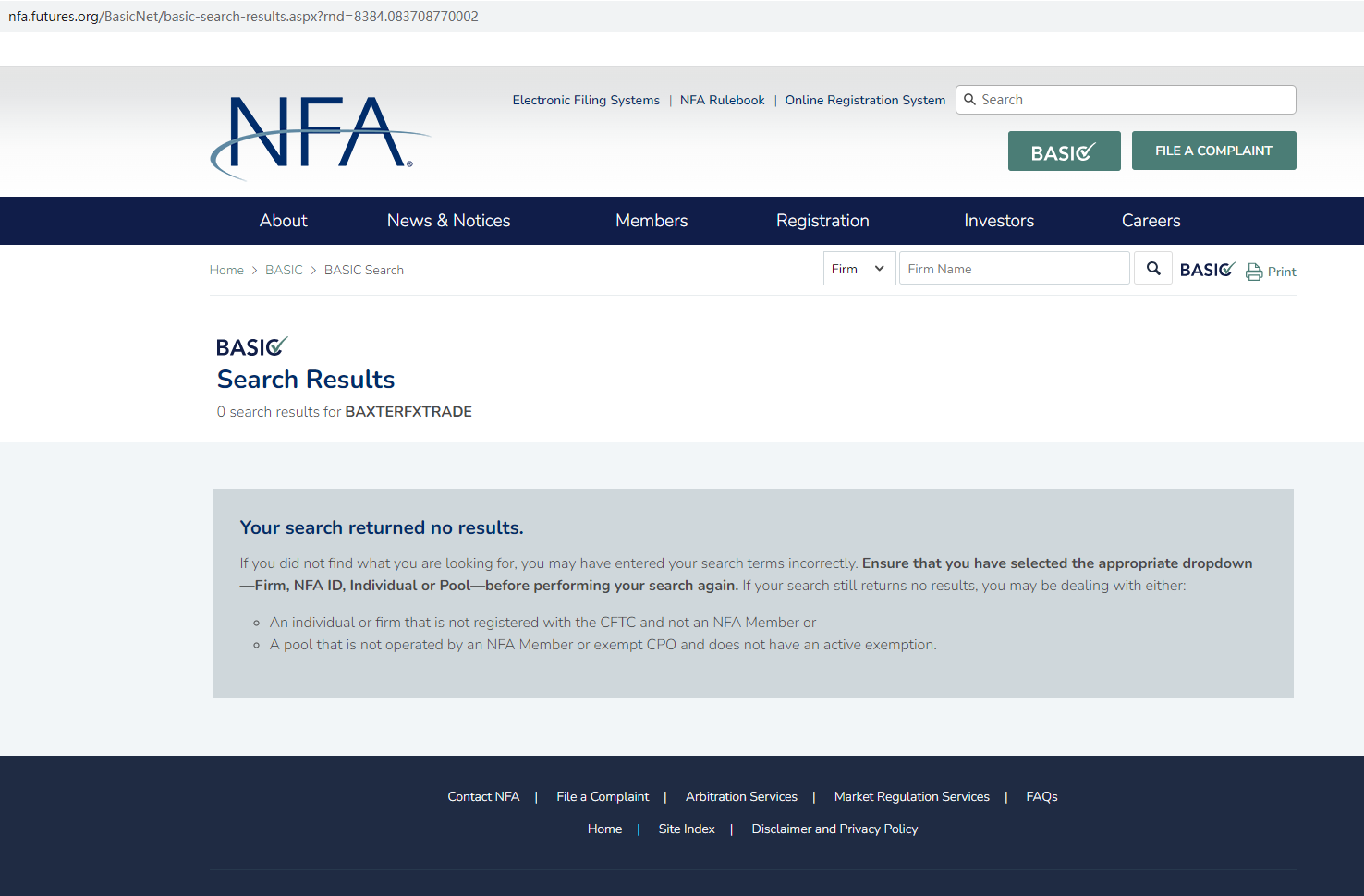 According to its website, it is located in the US, upon investigation, we didn't find any matching information in the National Futures Association (NFA). And it claims regulated by Financial Conduct Authority (FCA), but after verification, we found that the United Kingdom Financial Conduct Authority (UK FCA) issued a warning that BAXTERFXTRADE was providing financial services or products in the UK without authorisation.
