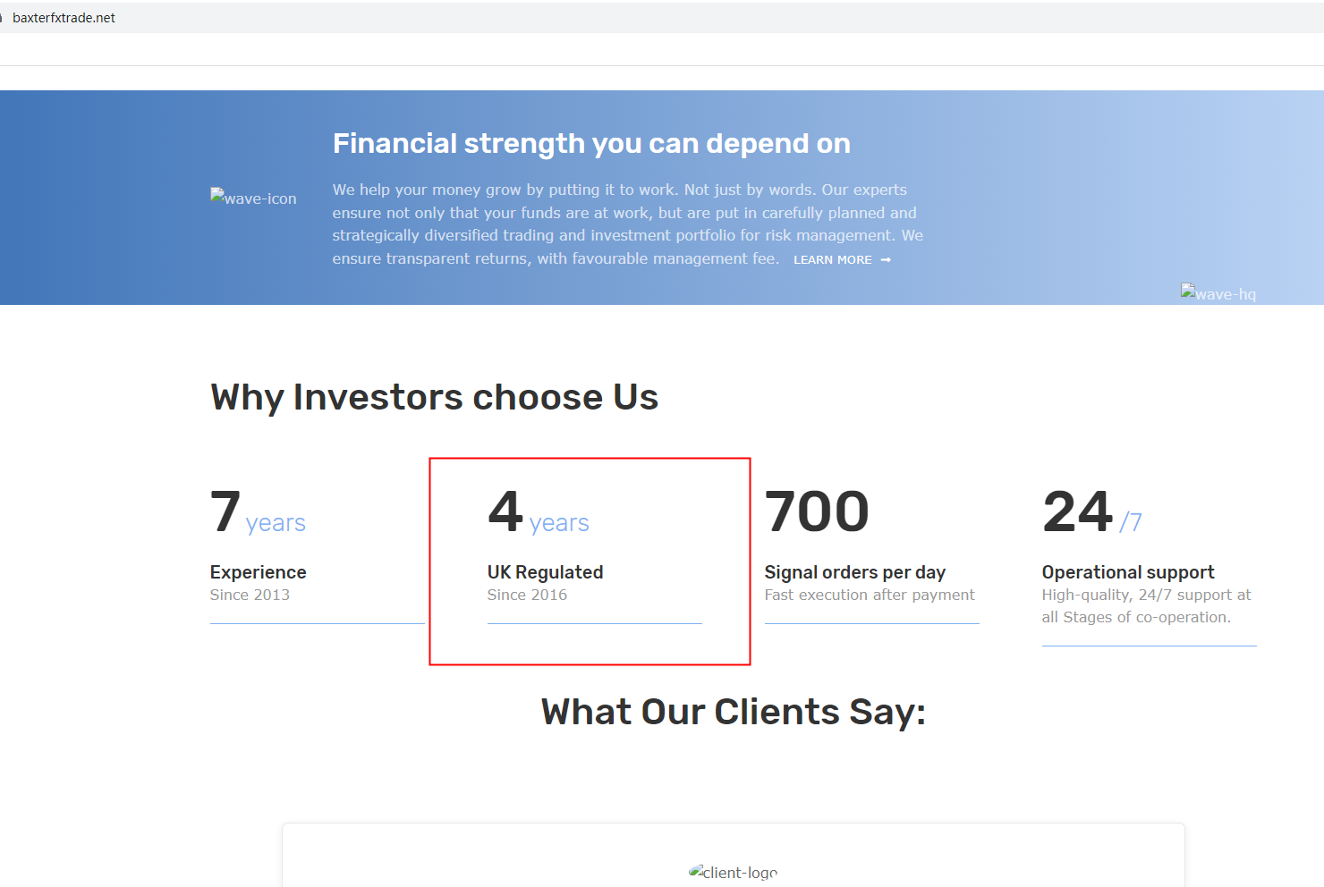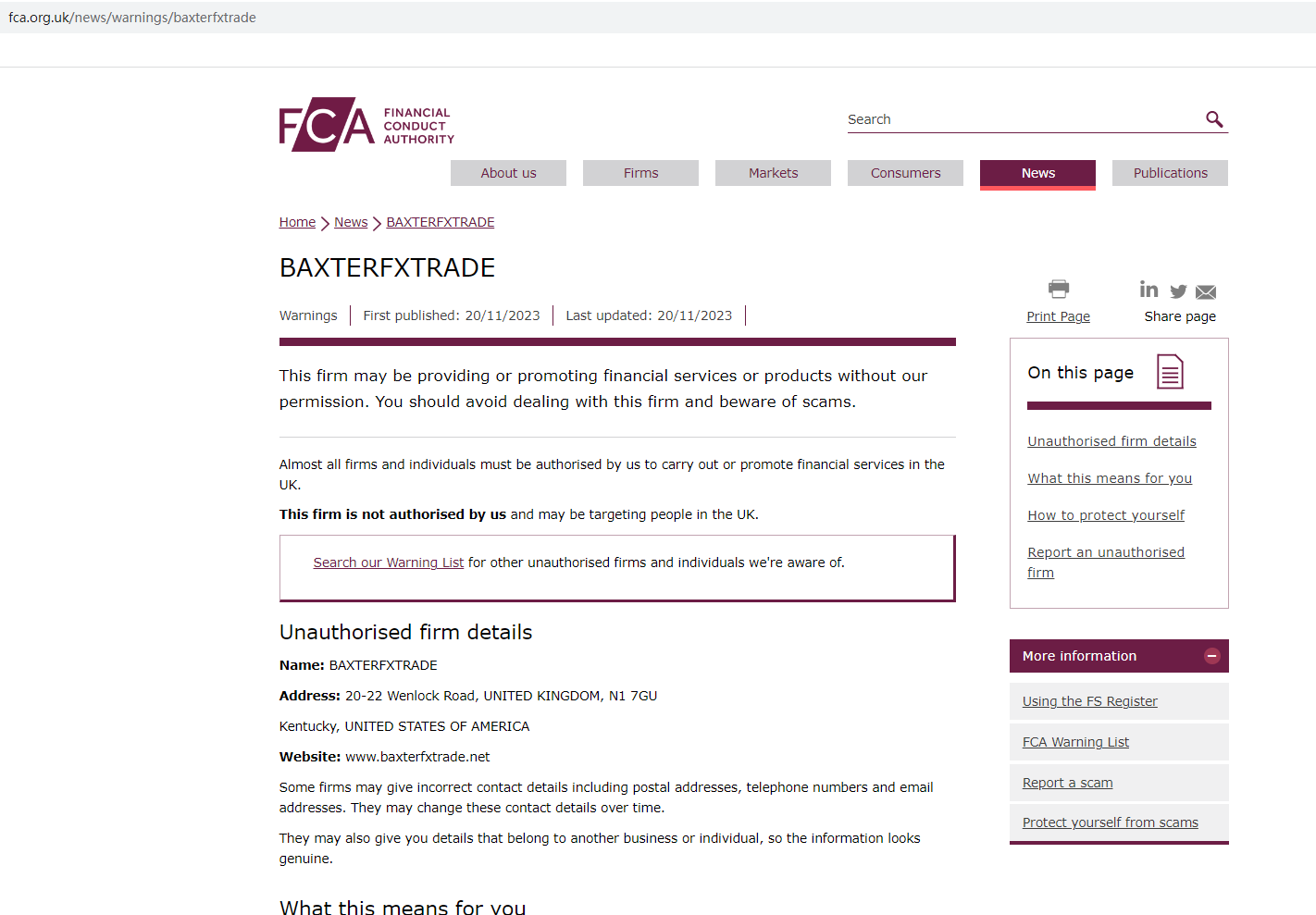 On 20 November 2023, the United Kingdom Financial Conduct Authority (UK FCA) issued a warning that BAXTERFXTRADE was providing financial services or products in the UK without authorisation. You may visit: https://www.fca.org.uk/news/warnings/baxterfxtrade