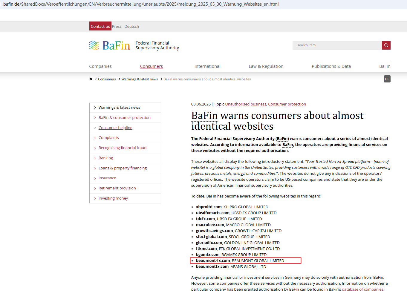 On June 3, 2025, the Federal Financial Supervisory Authority (BaFin) issued a warning against BEAUMONT for the lack of the required authorization. https://www.bafin.de/SharedDocs/Veroeffentlichungen/EN/Verbrauchermitteilung/unerlaubte/2025/meldung_2025_05_30_Warnung_Websites_en.html